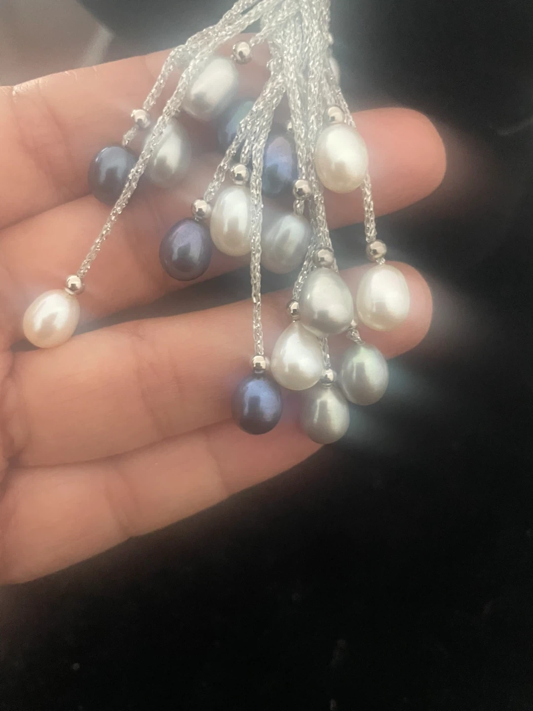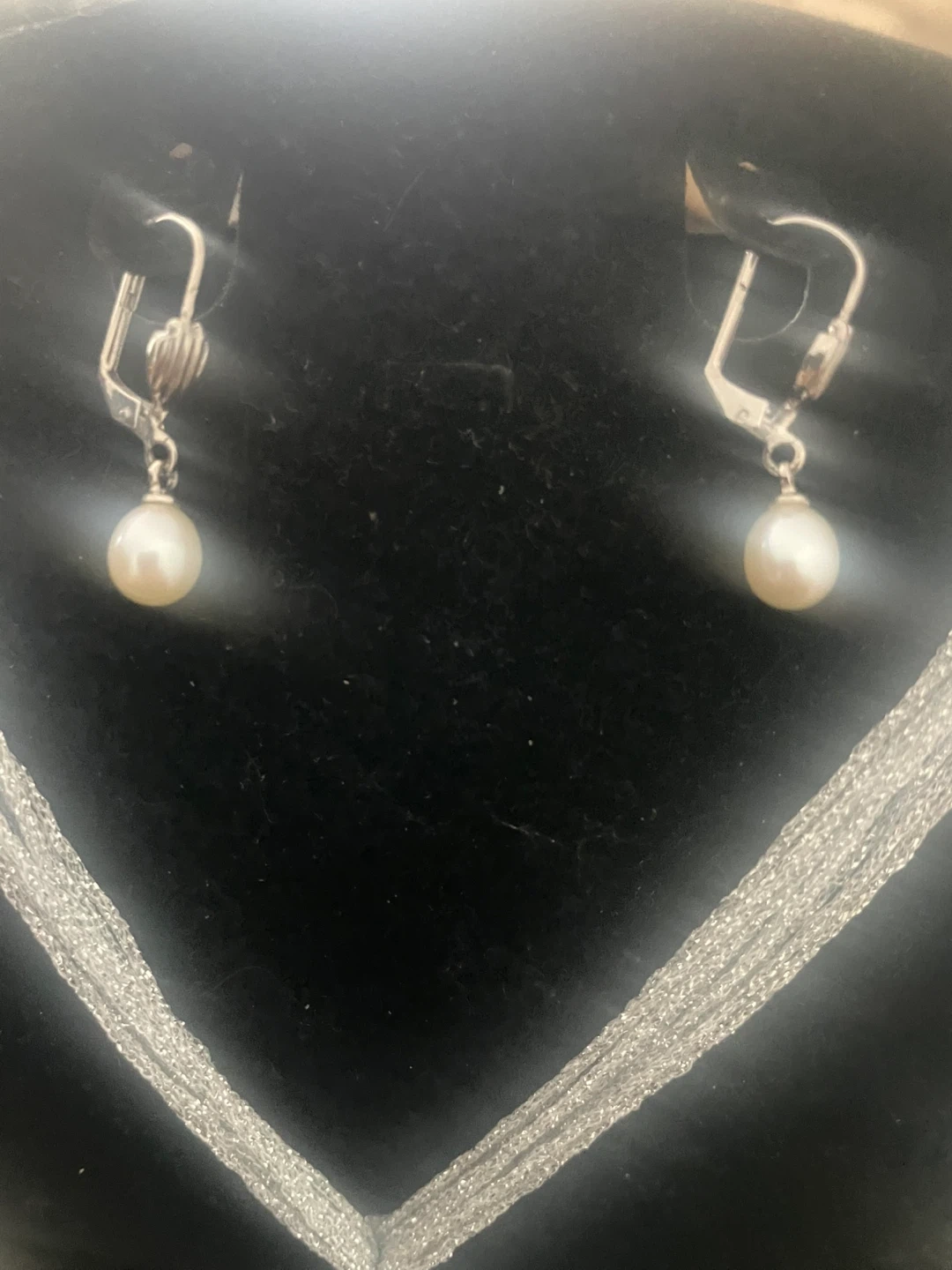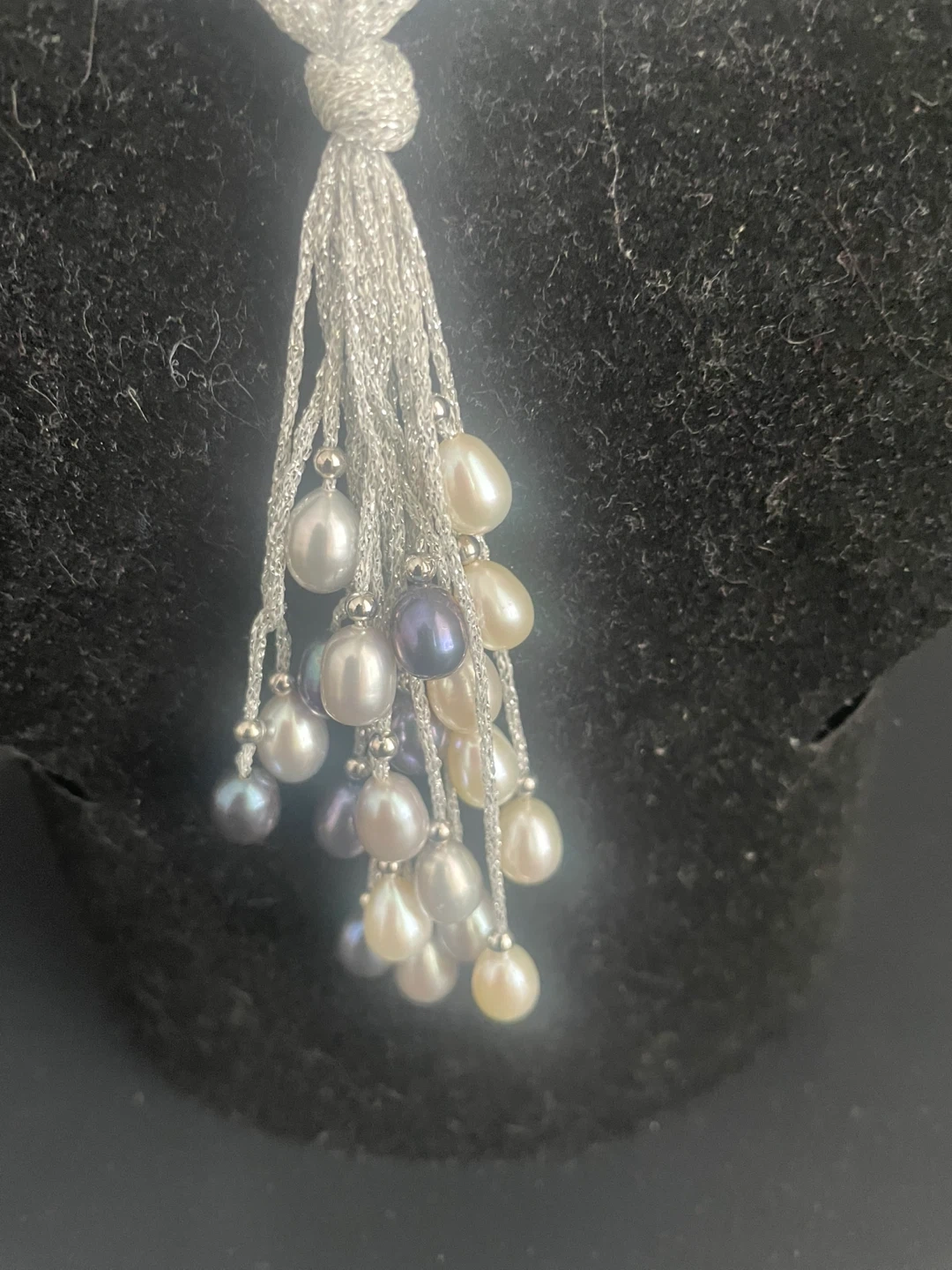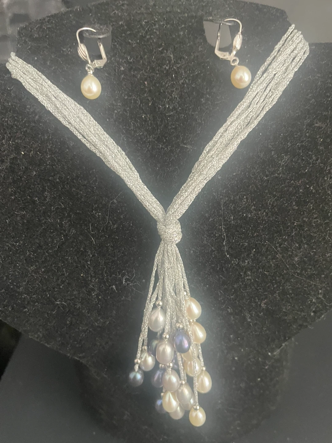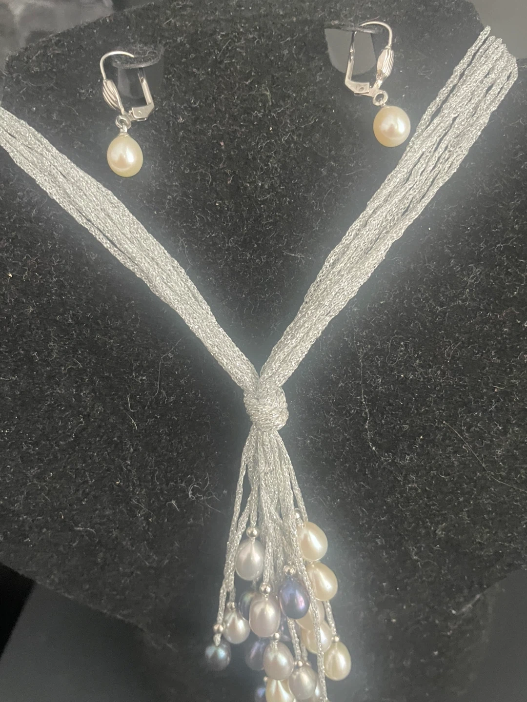 Here's a lovely pearl necklace and earrings set! The necklace features a multi-strand design with a knotted detail and pearl pendants. The earrings are a matching style with a single pearl drop. A beautiful addition to any jewellery collection