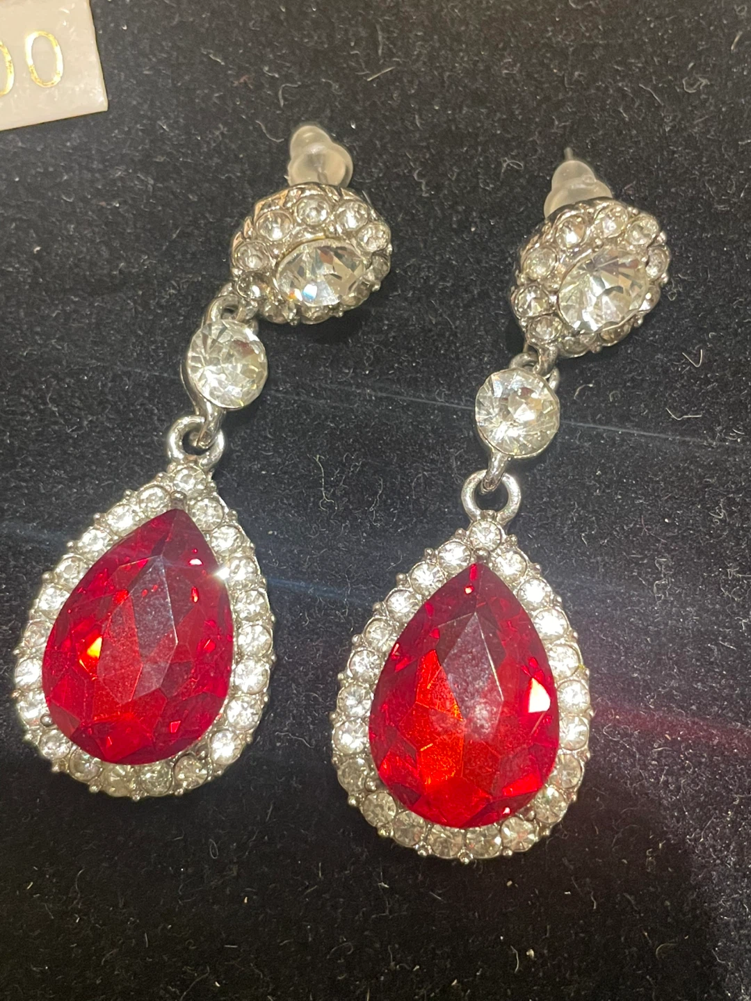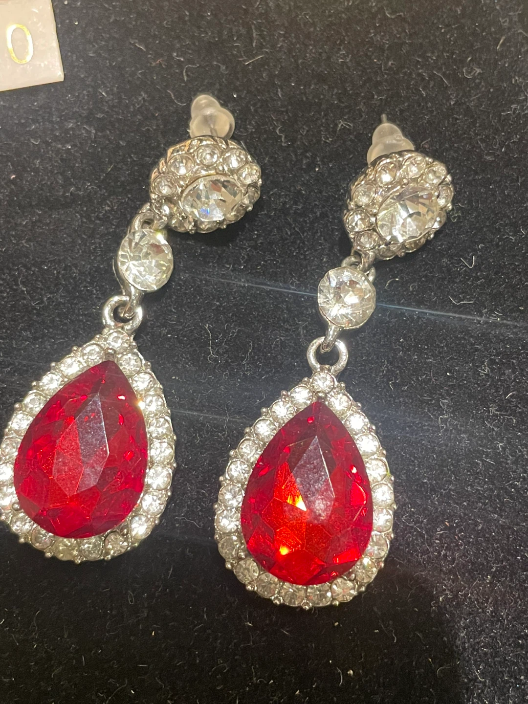 These are a pair of red teardrop dangle earrings. They feature a silver setting with clear stones around the red teardrop.