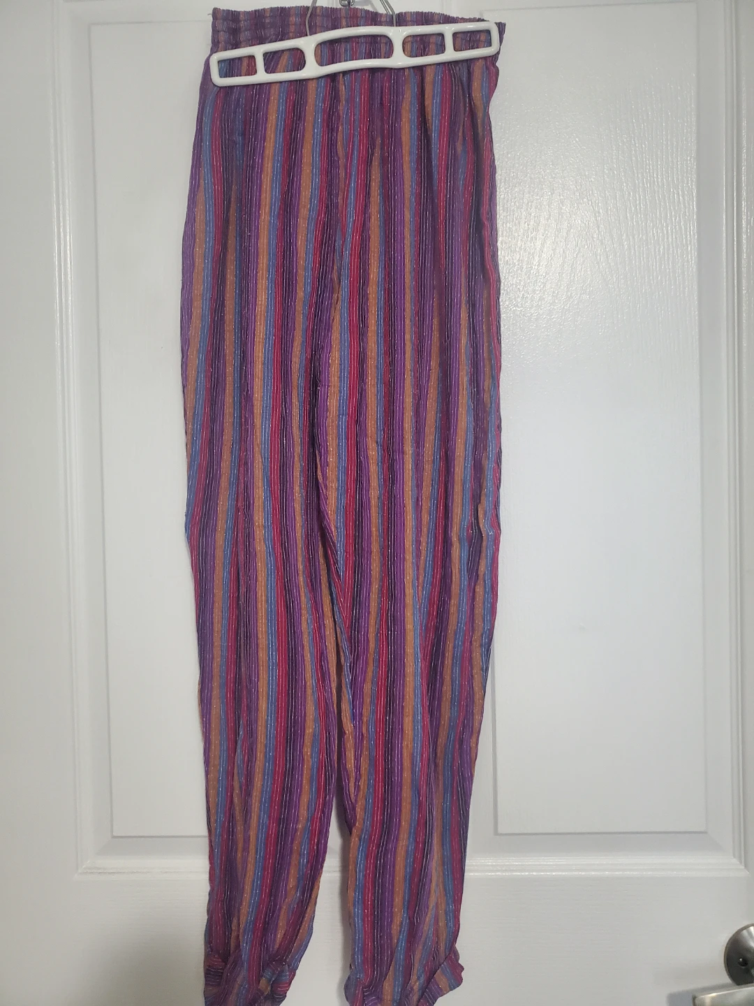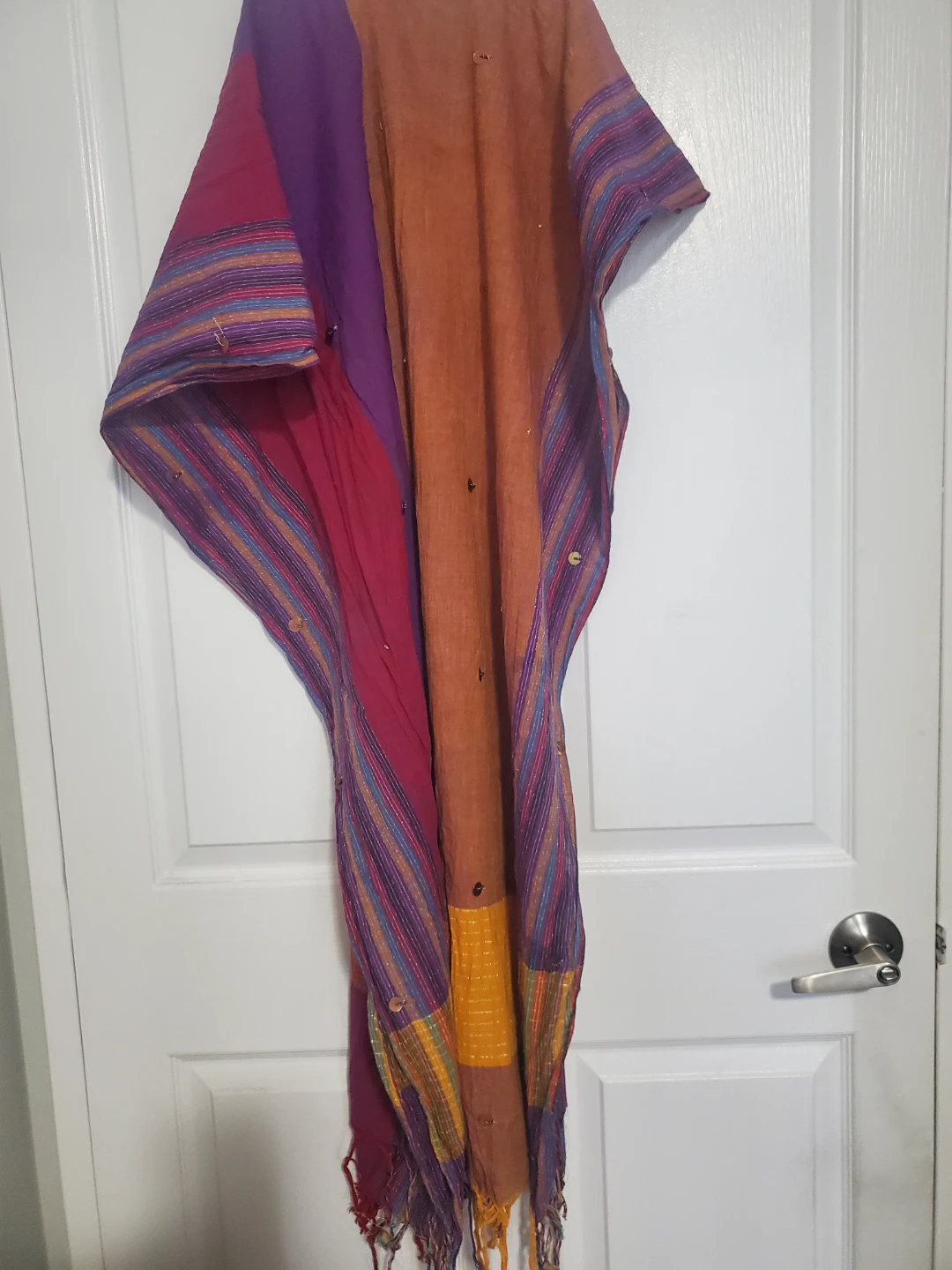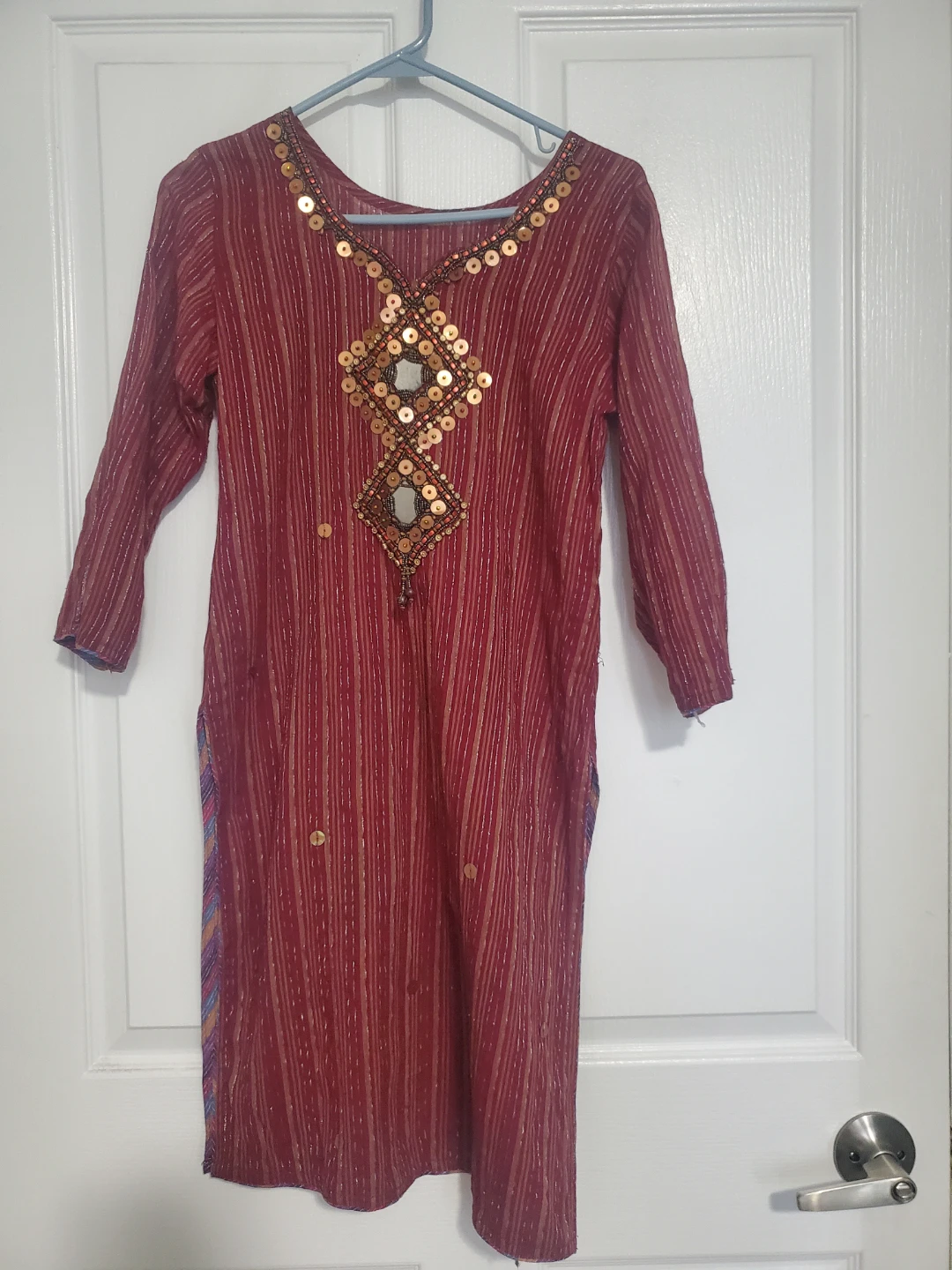 Selling a a good Salwar Kameez suit. Includes a pair of striped pants, a dark rose pink top with embellishments, and a colorful kaftan. All items are in good condition and ready for a new home! STEAM IRONED.