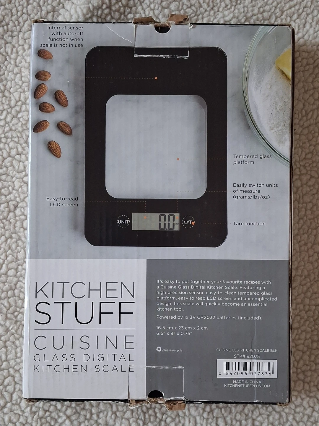 Selling a used Kitchen Stuff Cuisine glass digital kitchen scale! It has a tempered glass platform and an easy-to-read LCD screen. It's easy to switch units of measure (grams/lbs/oz) and has a tare function. The scale measures 16.5 cm x 23 cm x 2 cm (6.5" x 9" x 0.75"). Box included!