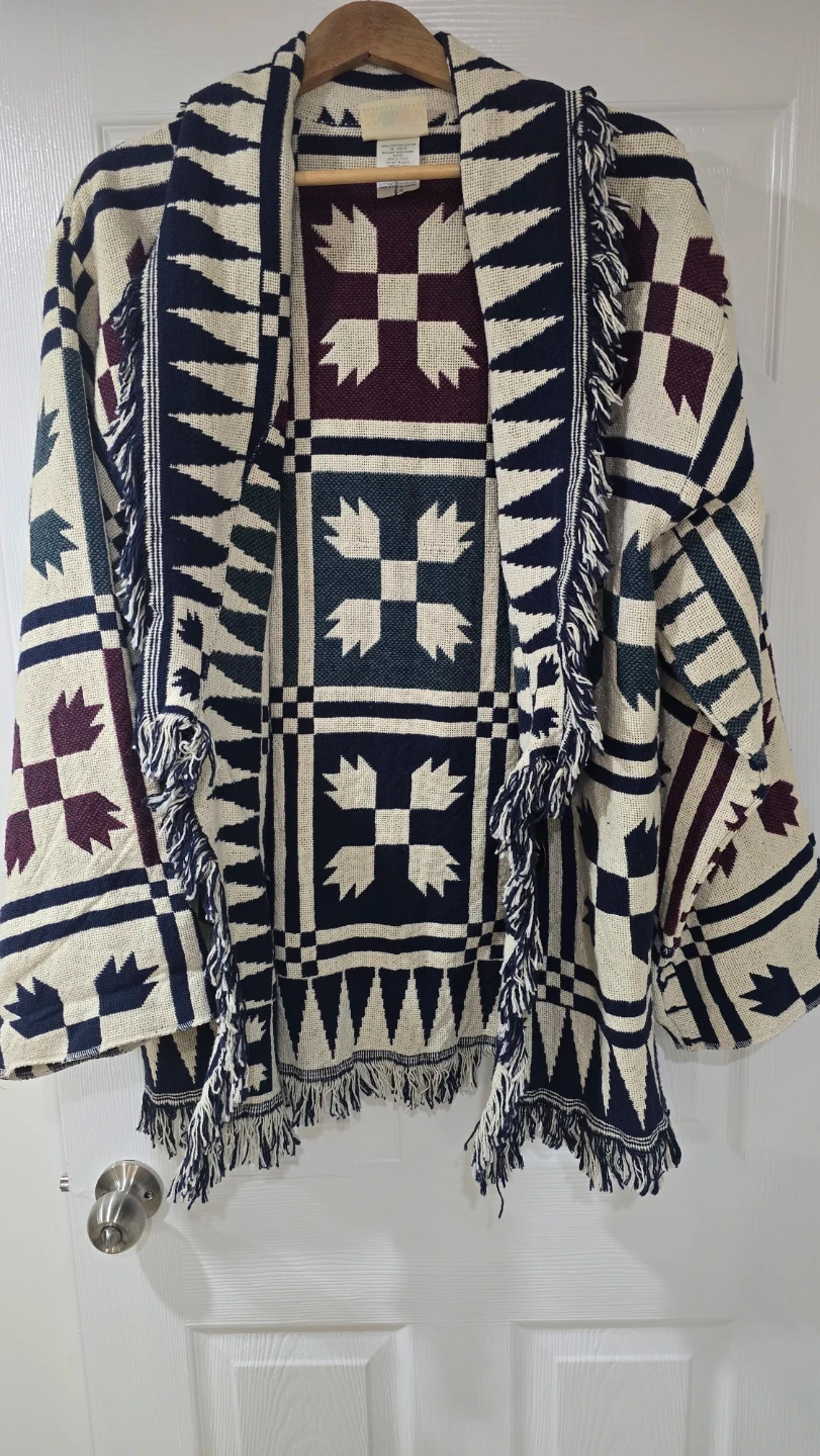 Cozy up with this vintage cotton cardigan! It features a unique geometric pattern in navy, cream, green, and burgundy. The cardigan has a relaxed fit and fun fringe detailing, perfect for adding a touch of boho style to your wardrobe
