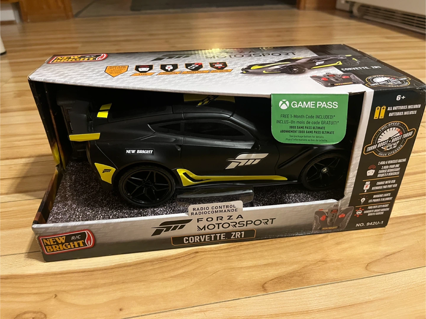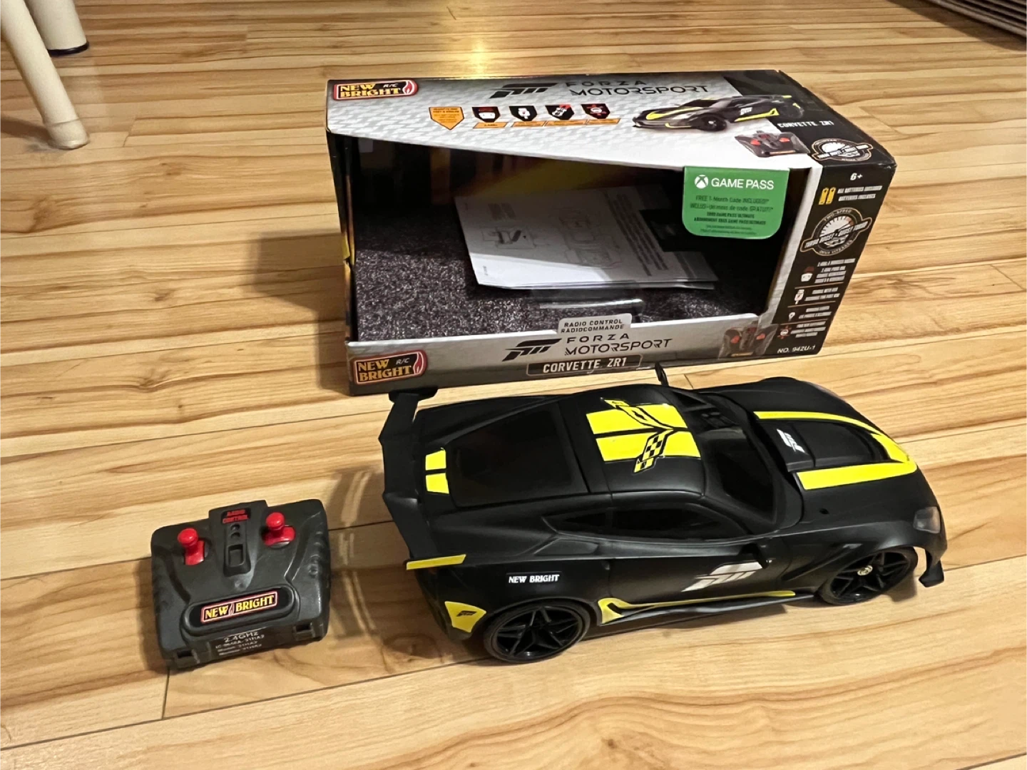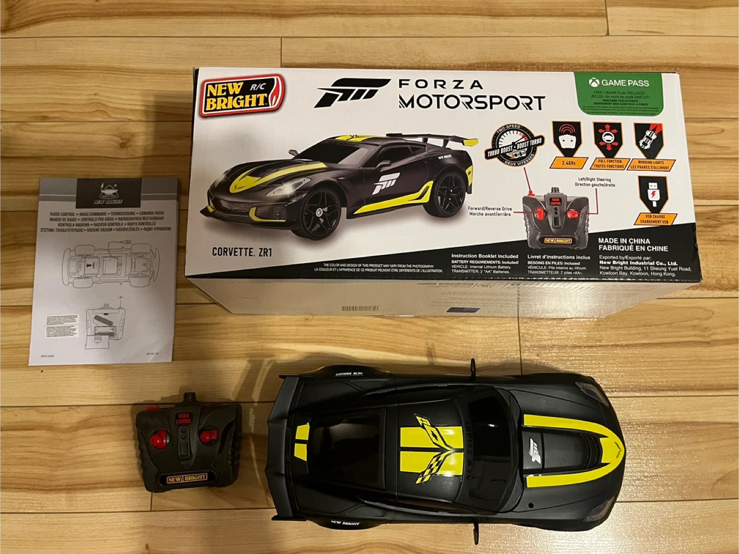 Selling a New Bright Forza Motorsport Corvette ZR1 radio control car. It comes with the remote control and instruction booklet. The box says it includes a free 1-month code for Xbox Game Pass. It also features working lights and two-speed turbo.