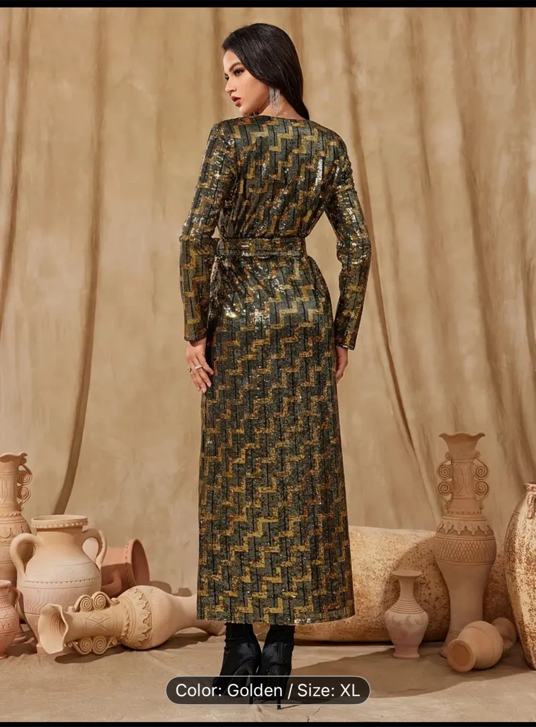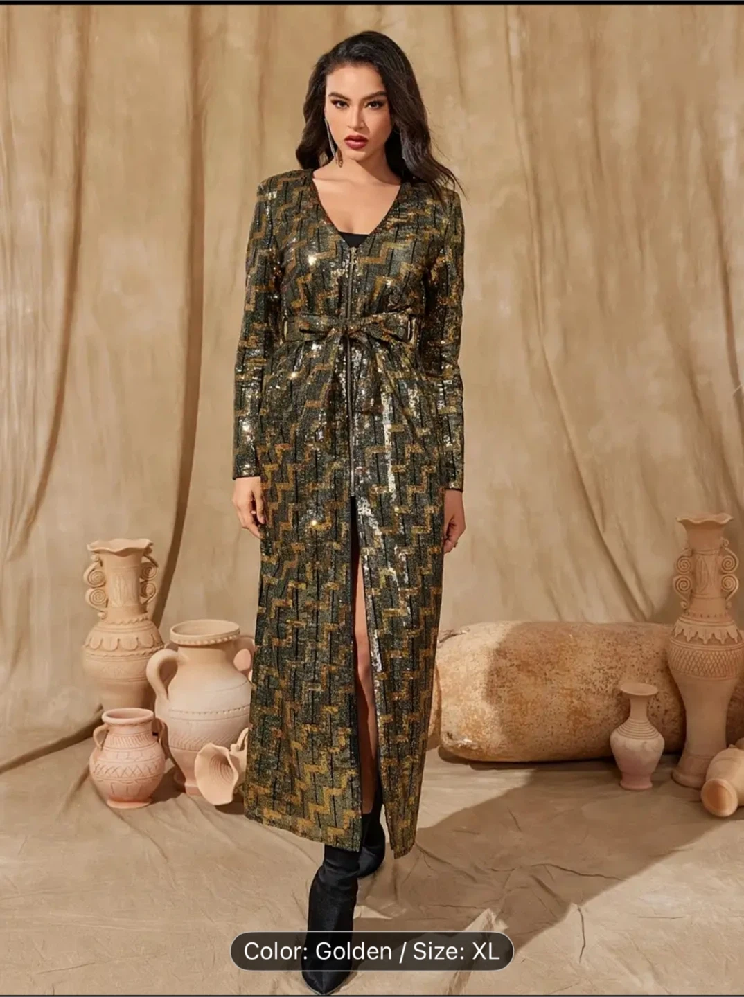 Selling a stylish golden sequin duster coat ! This eye-catching coat is perfect for adding a touch of glamour to any outfit. It features a longline silhouette and all-over sequin embellishments. Great for parties or special occasions!