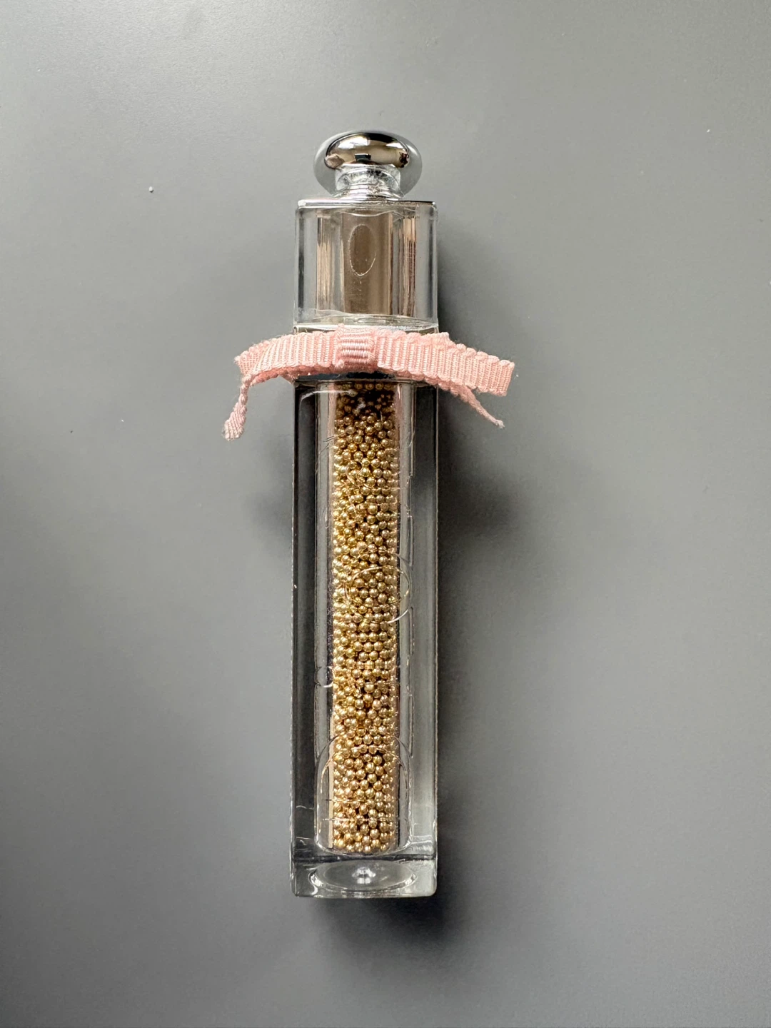 Decorative piece is a cute empty parfum bottle filled with tiny gold beads. Something to put on your vanity!