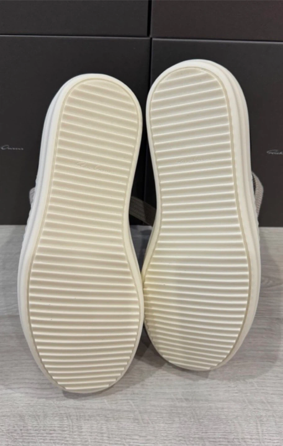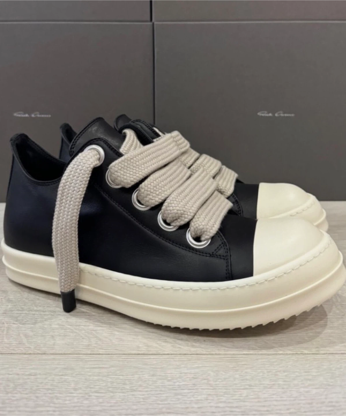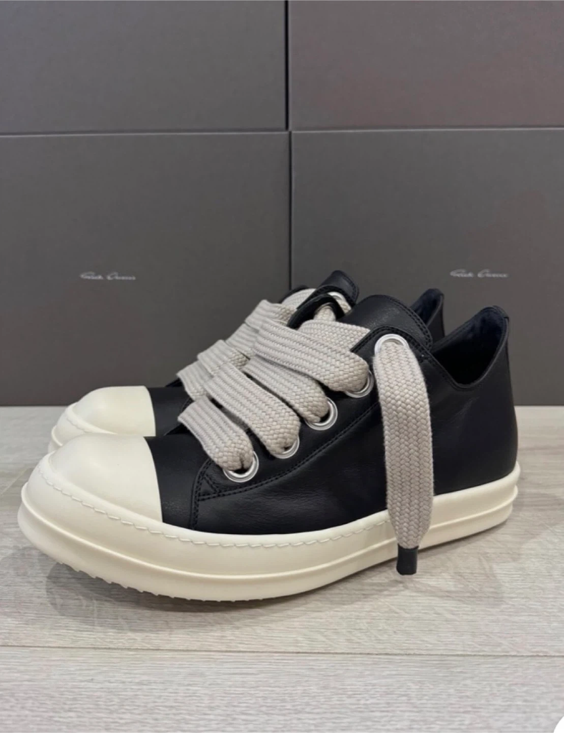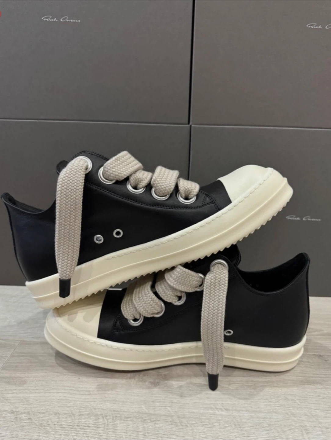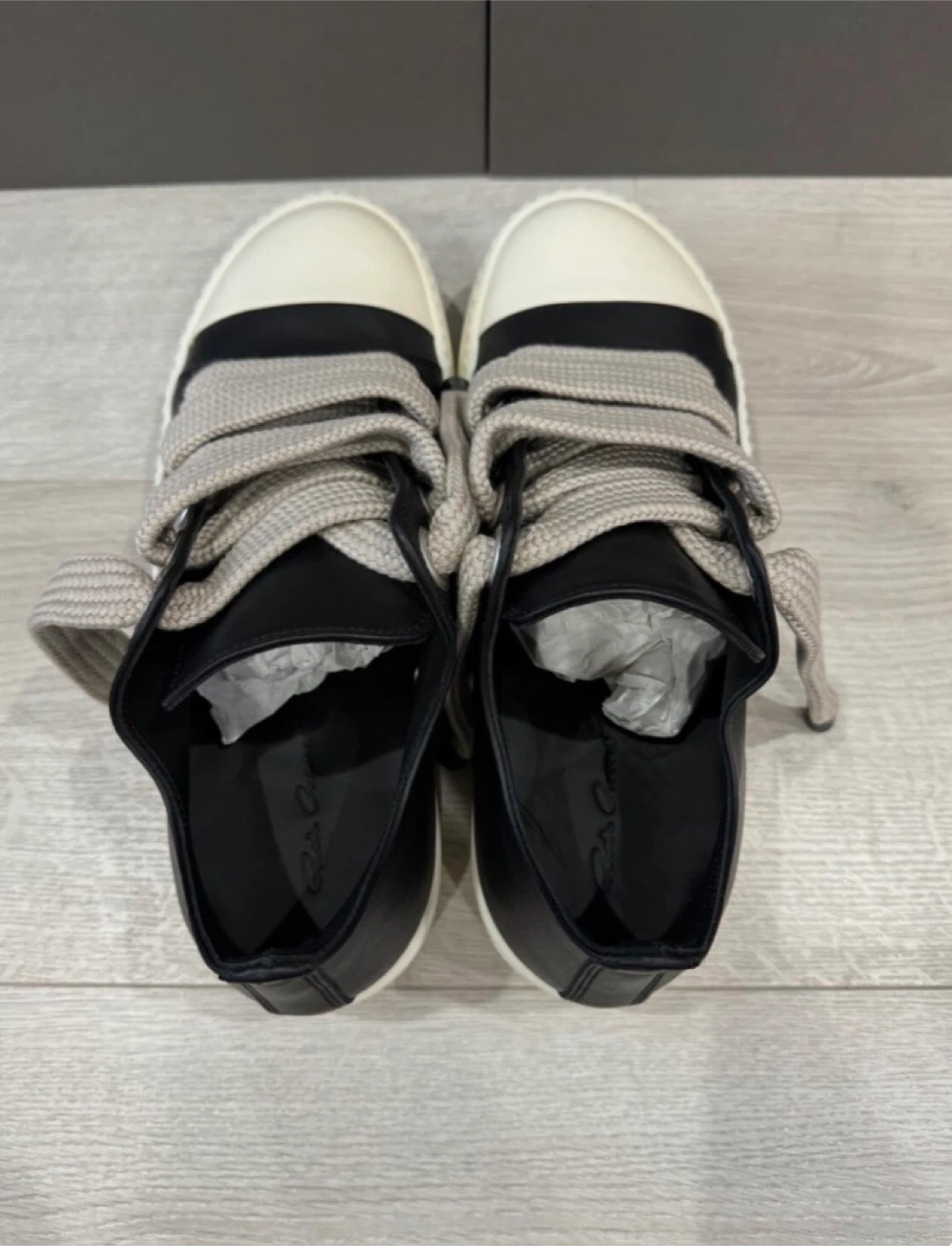 Selling a pair of Rick Owens low top sneakers in black and white. They feature a unique lace-up design and are in great condition. These stylish sneakers are perfect for adding an edgy touch to any outfit!
