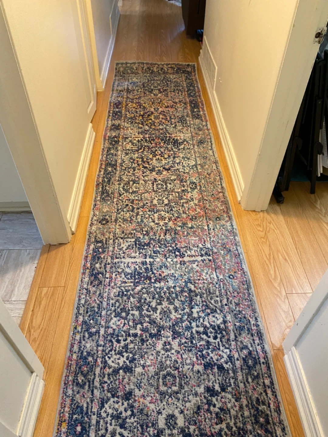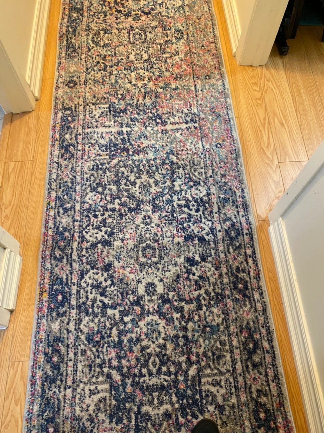 Selling a nuLoom Bodrum rug in blue! It's made of 100% polypropylene and measures 2'6 x 12'. It has a beautiful design and would look great in any home. Great runner used in home staging. Like new, no wear, stains. Pet free, smoke free