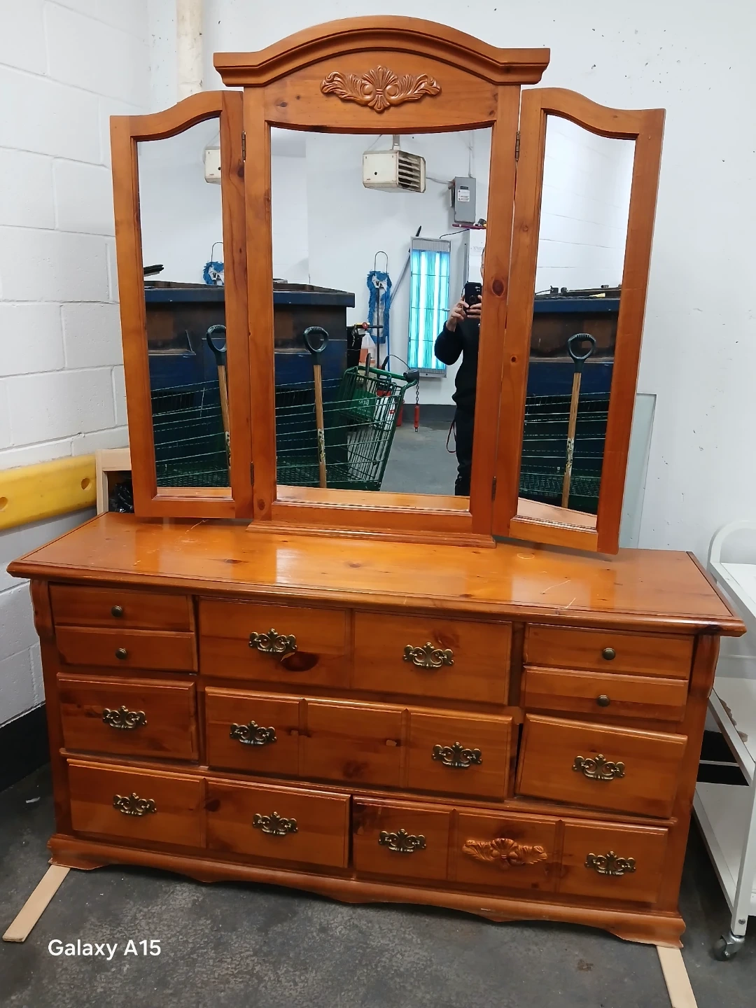 Here's a wooden dresser with an attached mirror. It has a lot of drawers for storage! The dresser is in good condition and would look great in any bedroom and made from hardwood Quick selling need gone asap Pick up 503 beecroft rd