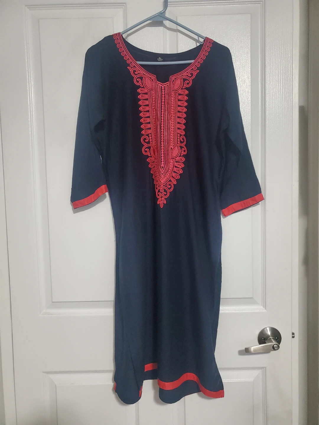 Selling a lovely navy blue kurti with beautiful red embroidery. It's in great condition and perfect for everyday wear. Size is XL. STEAM IRONED.