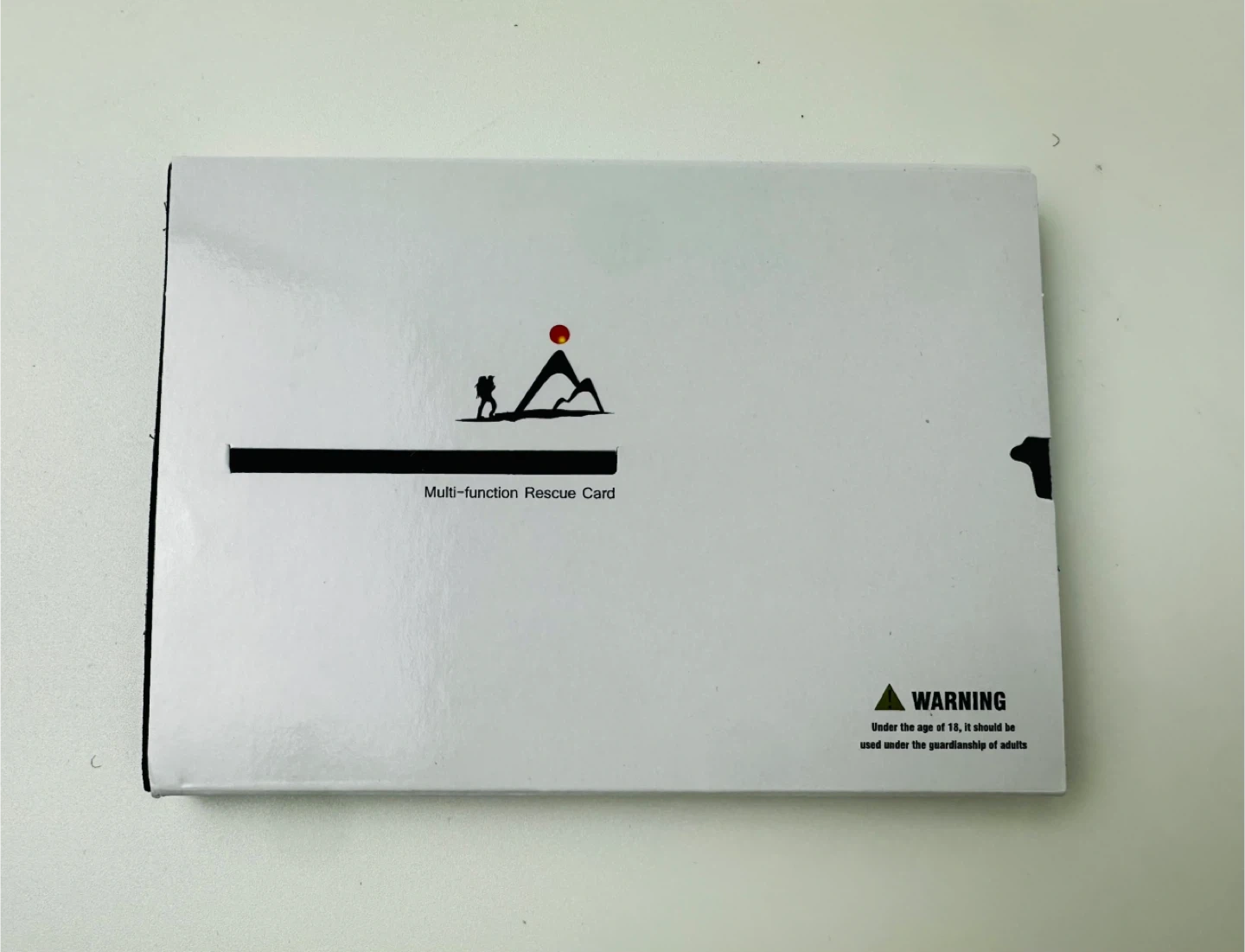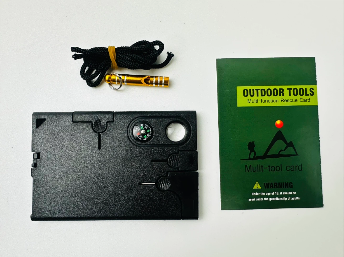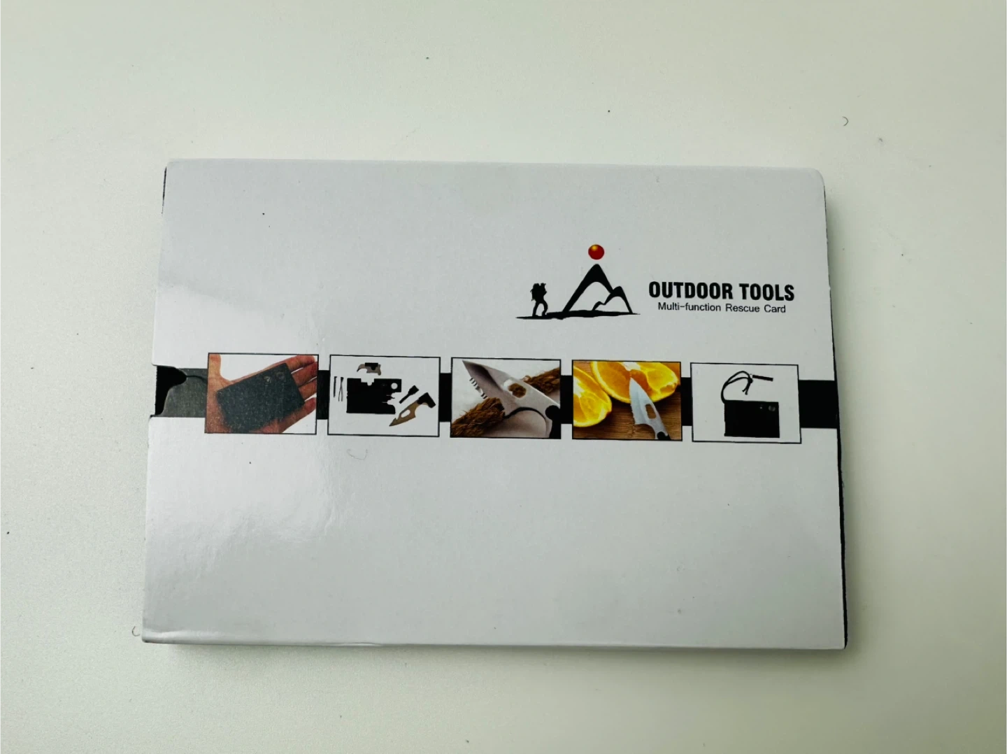 Compact 12-in-1 survival tool card, brand new in box. Perfect for hiking, camping, car glovebox, or emergency kits.