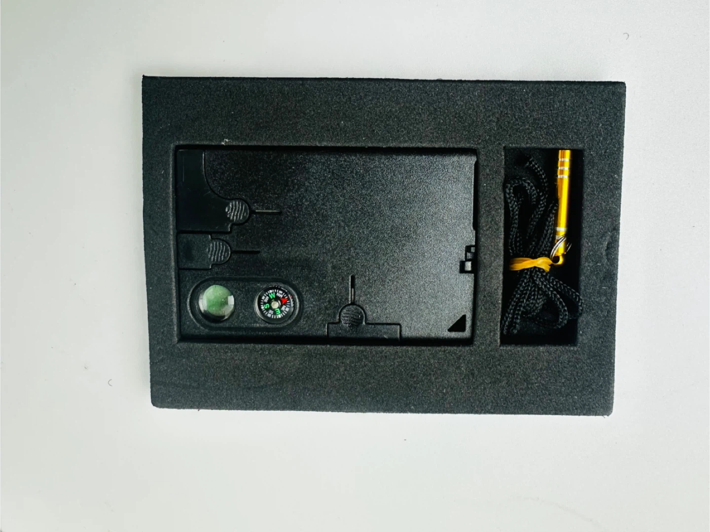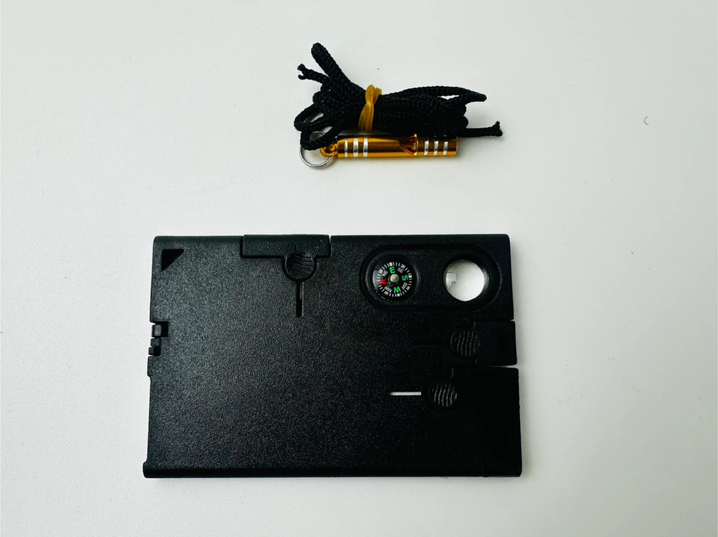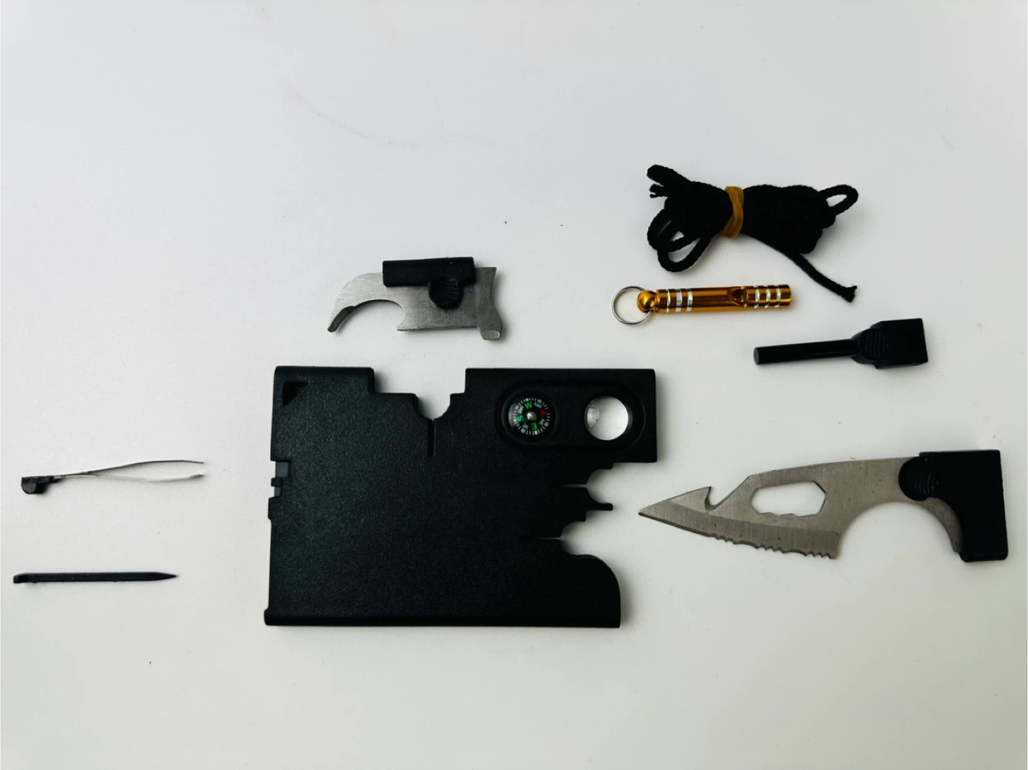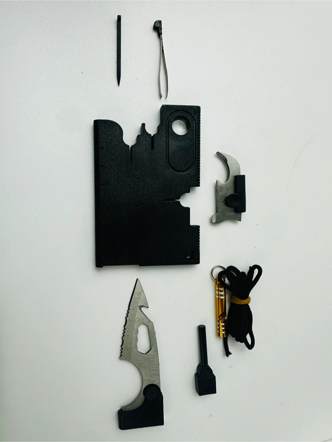 Compact 12-in-1 survival tool card, brand new in box. Perfect for hiking, camping, car glovebox, or emergency kits.