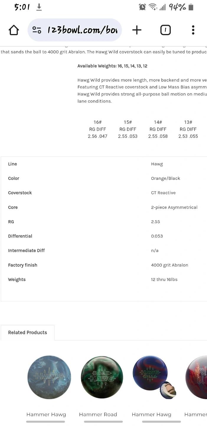 The Hammer Hawg Wild features a strong performance core and Hammer's new CT Reactive coverstock to produce hook in oil with strong backend. Ball Specifications: The Hawg Wild is a ball for Medium to Heavy oil lane conditions as it provides hook in oil with a strong backend reaction. The Hawy Wild features a strong asymmetric performance core and Hammer's new CT reactive coverstock to produce all-purpose ball motion. The Engine: The Hawg Wild features a unique asymmetric core design providing a higher RG and a Low Mass Bias Rating. By designing the core shape to be a higher RG and Low Mass Bias ball, the Hawg Wild will produce strong backend hook. The Tires: The new CT Reactive coverstock will give the bowler hook in oil with a stronger move on the backend compared to the original Hawg. The Hawg Wild features Hammer's new Wet-Shine finish that sands the ball to 4000 grit Abralon. The Hawg Wild coverstock can easily be tuned to produce a longer and stronger ball motion