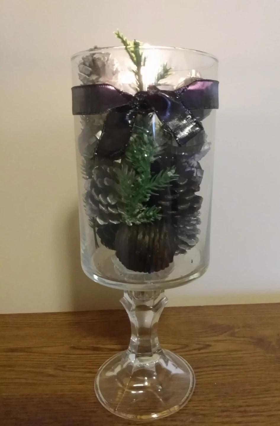 This is a glass pedestal vase filled with pine cones and decorative greenery. It also features a black ribbon tied around the top. It would be a great addition to your home decor!