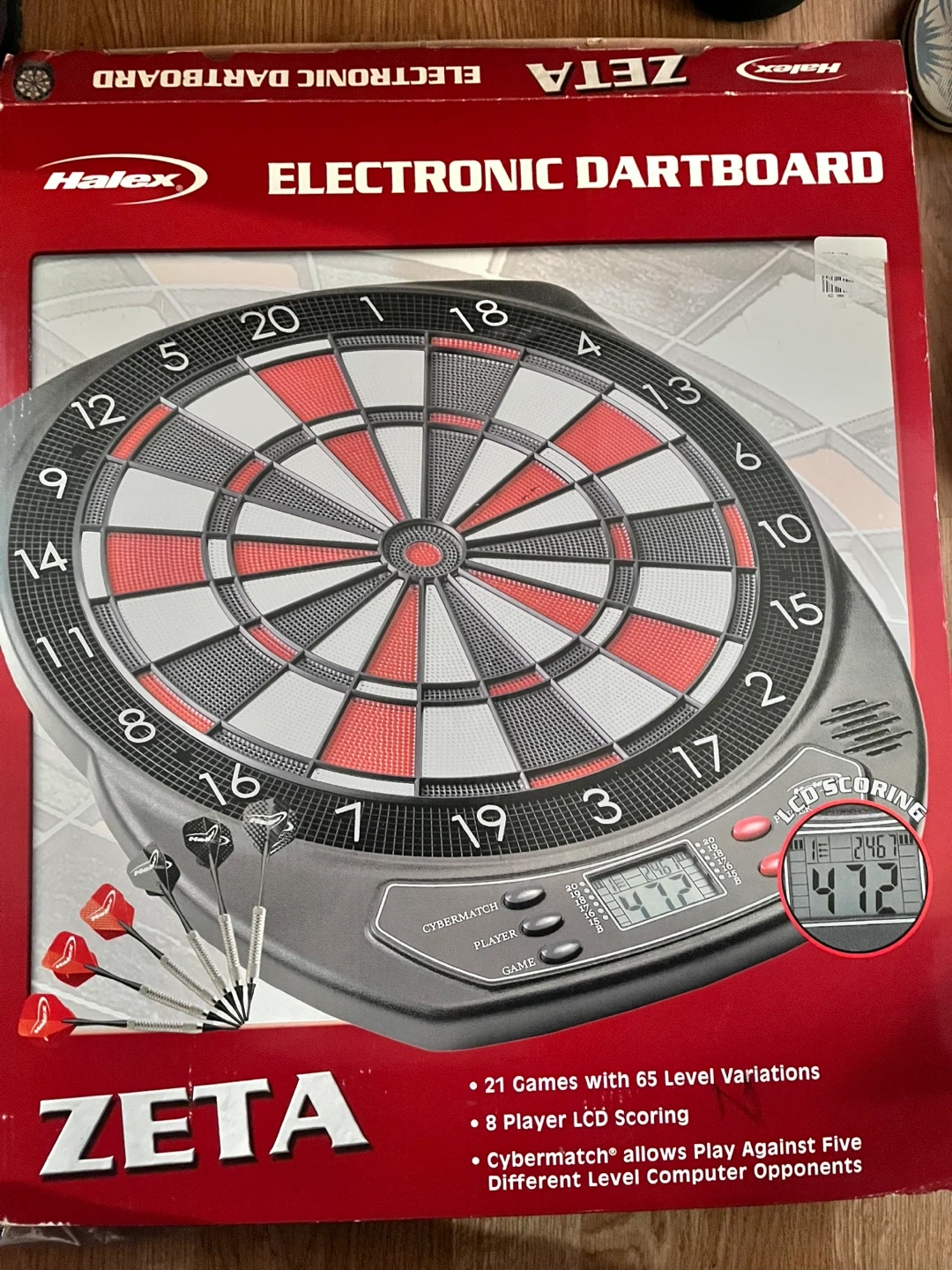 Selling a Halex Zeta Electronic Dartboard! It comes with 21 games with 65 level variations. It also has 8 player LCD scoring and Cybermatch allows play against five different level computer opponents. Comes with owner's manual and game instructions. Open box but new