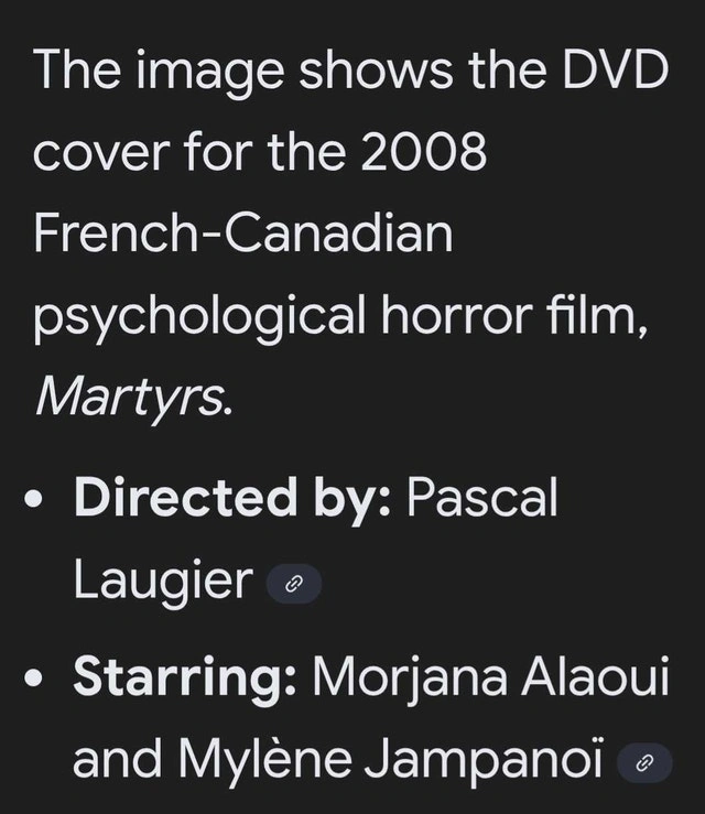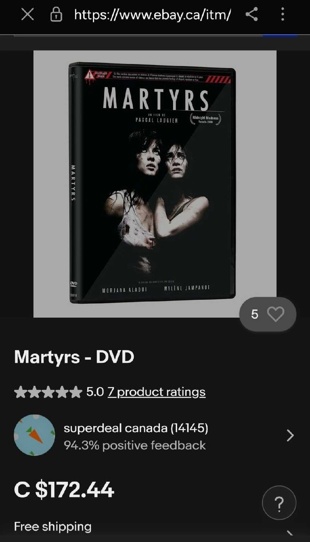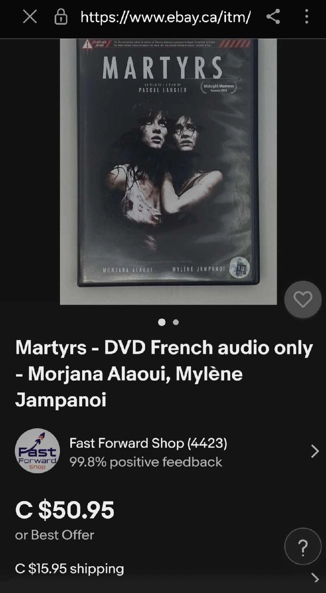 Dive into the disturbing depths of psychological horror with the 2008 French-Canadian film, Martyrs, available on DVD. This used DVD is in acceptable condition, ready to deliver a chilling cinematic experience. Very much a collectible as you will see online. Check my pictures. This DVD is looking for a new home. If the ad's still up, it's still available!
