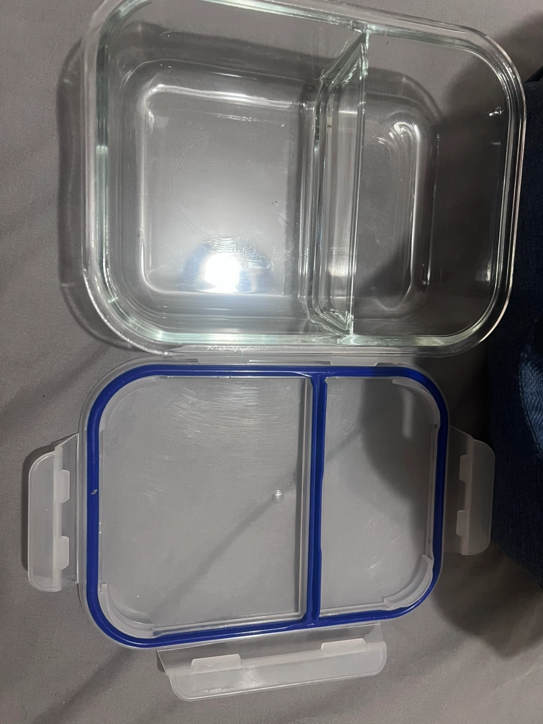 Selling a glass-style lunch box that's perfect for taking meals on the go! It comes with a handy bag to keep your food at the right temperature. The lunch box has compartments to keep different foods separate, and the bag is a nice denim colour
