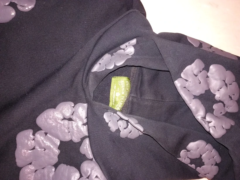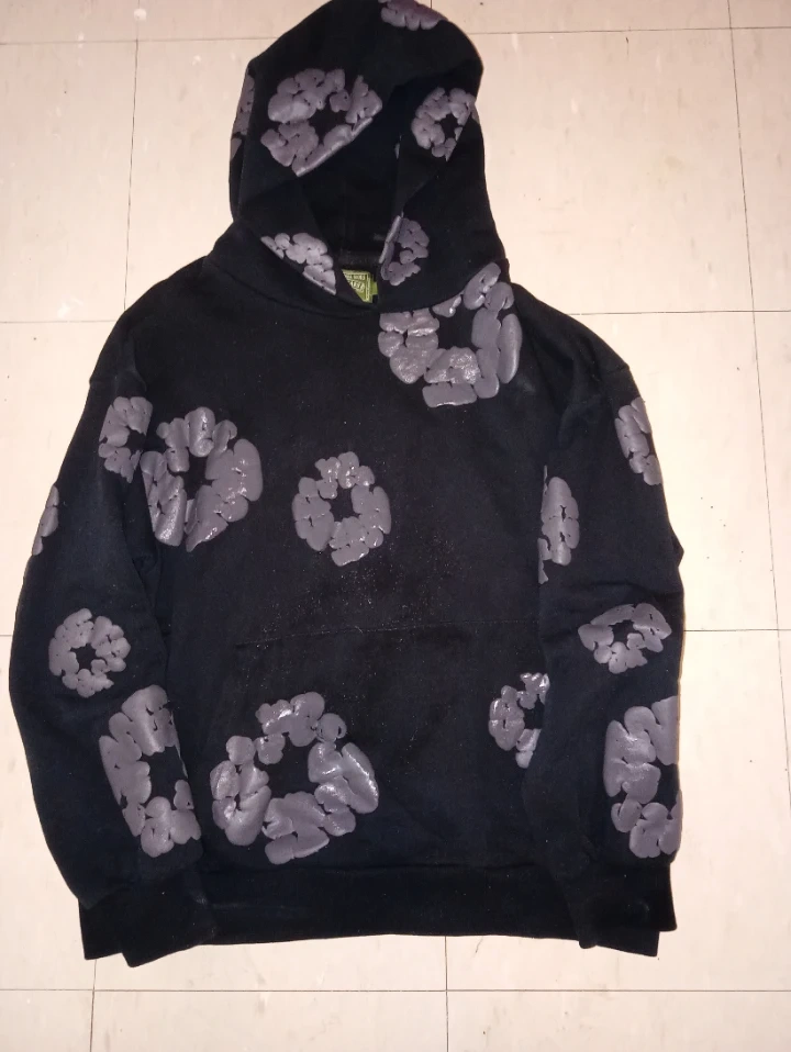 Selling a black hoodie from Denim Tears. The hoodie has a unique design with grey floral patterns. The material is 100% cotton and it is made in the USA. It's in great condition and ready for a new owner!