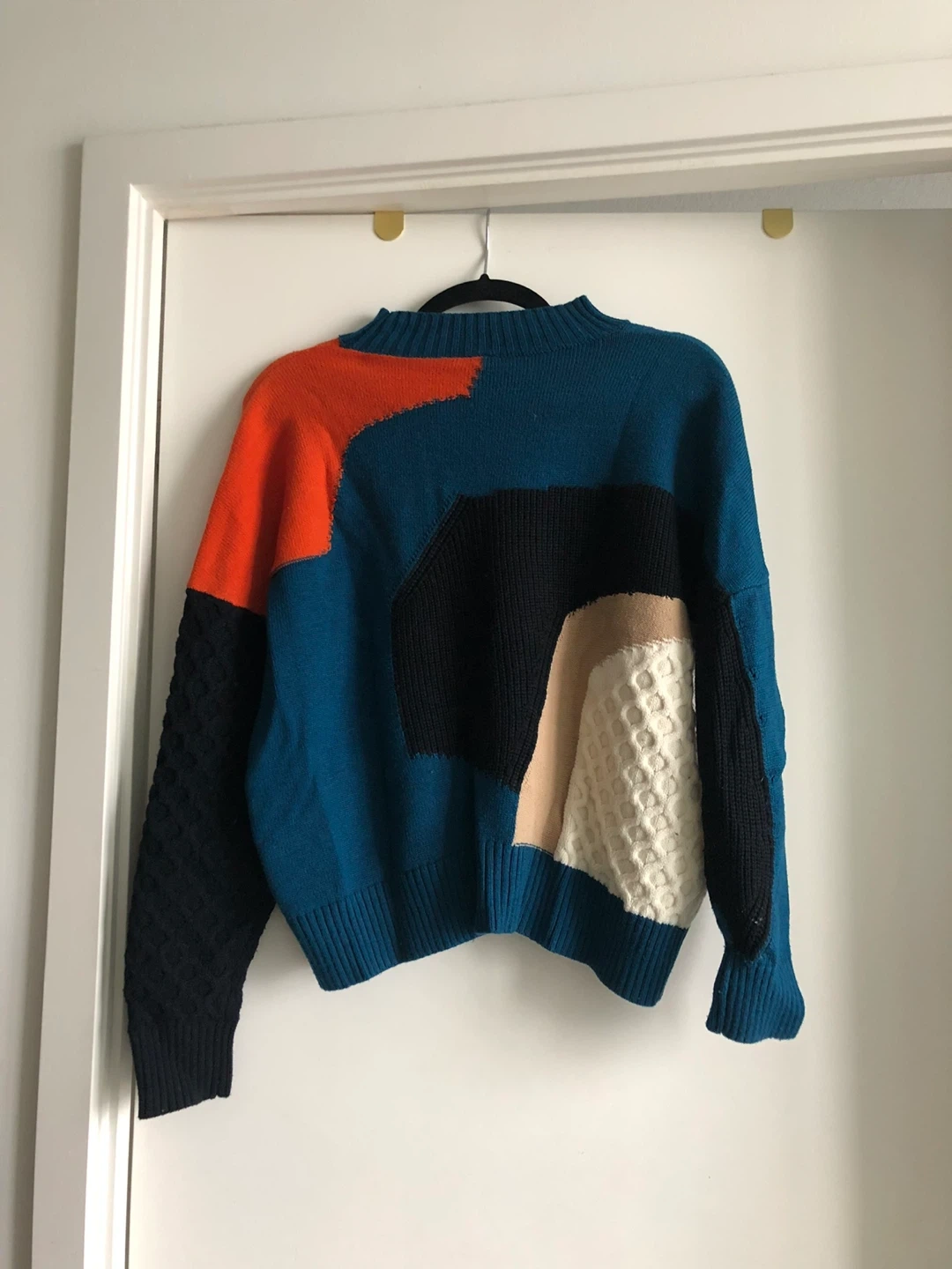 Selling a colour block sweater with a unique design. It features a mix of textures and colours, making it a standout piece for your wardrobe! Perfect for adding a pop of colour to any outfit