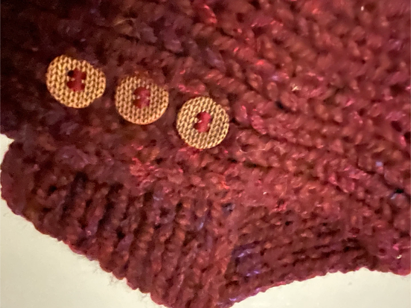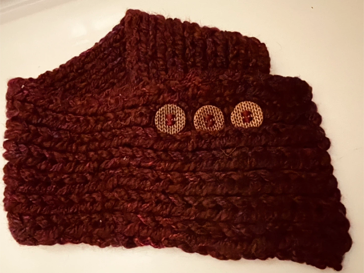 Selling a handmade knit cowl in a lovely maroon colour! It has three decorative buttons on the front. Perfect for keeping warm on chilly days!