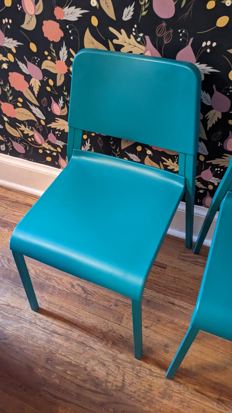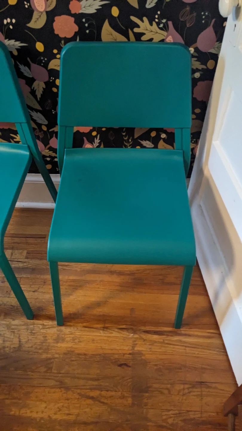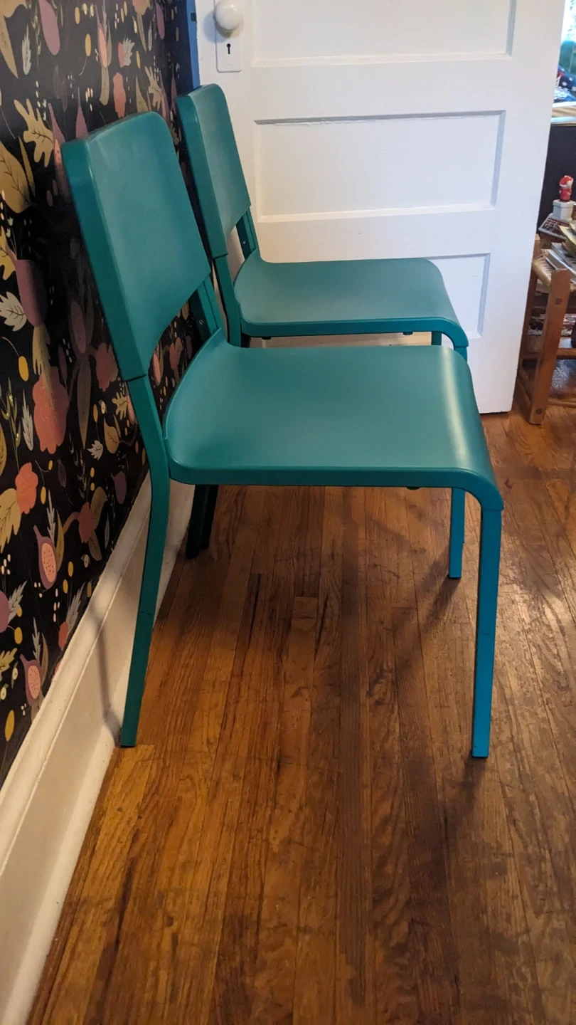 Selling a set of two teal blue chairs! They're in great condition and would look great in any room. They are sturdy and comfortable, perfect for a dining table or desk. Indoor Outdoor.