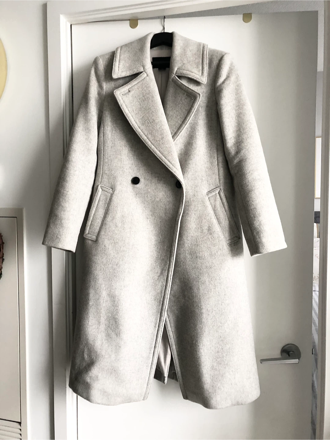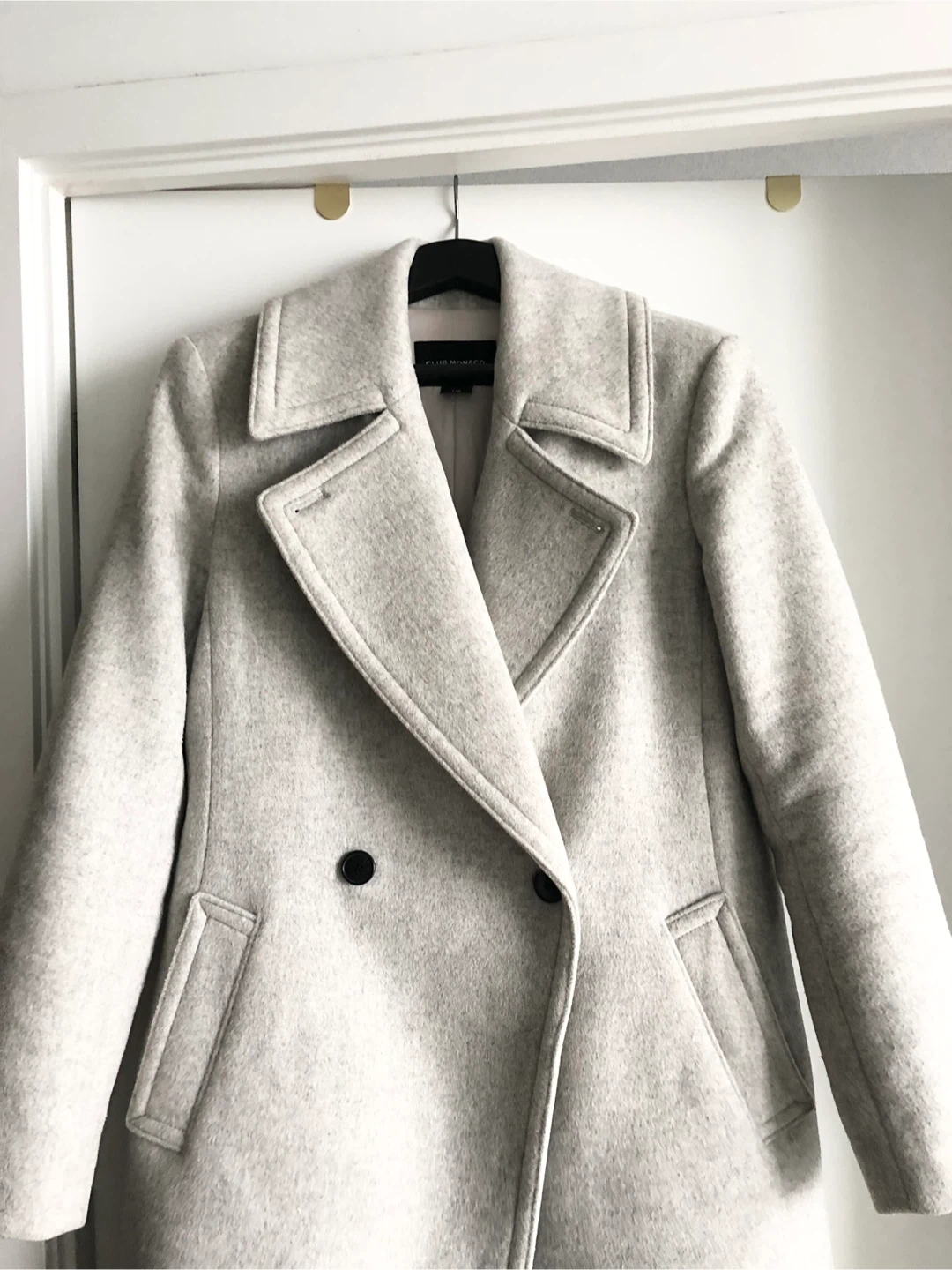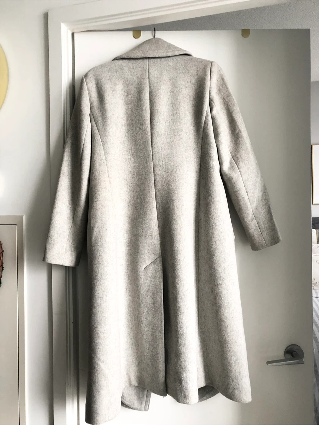 Selling a Club Monaco wool 80% and 20% nylon coat in a lovely light grey colour. It's a size L and in good condition. A slight imperfection on the lining inside, as shown in photo 6, but it can be cleaned. Perfect for this cold season and keeping warm.