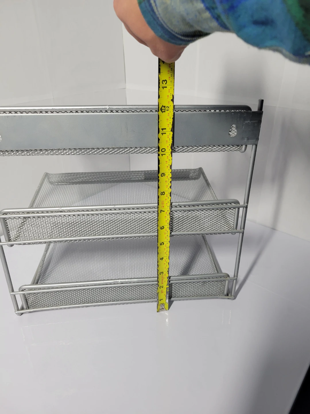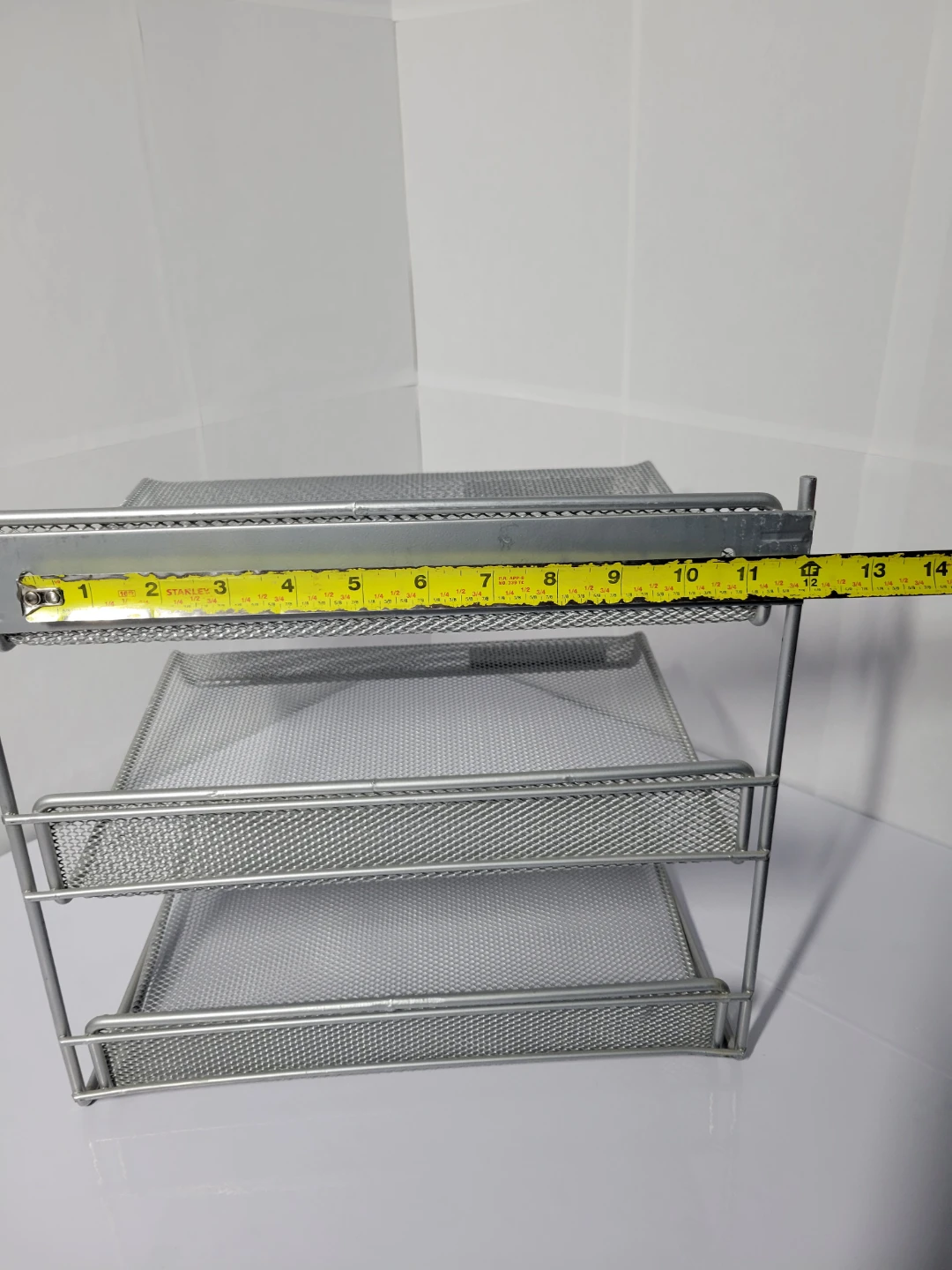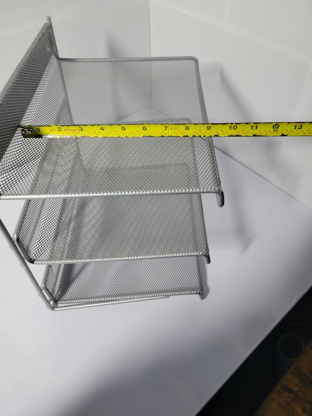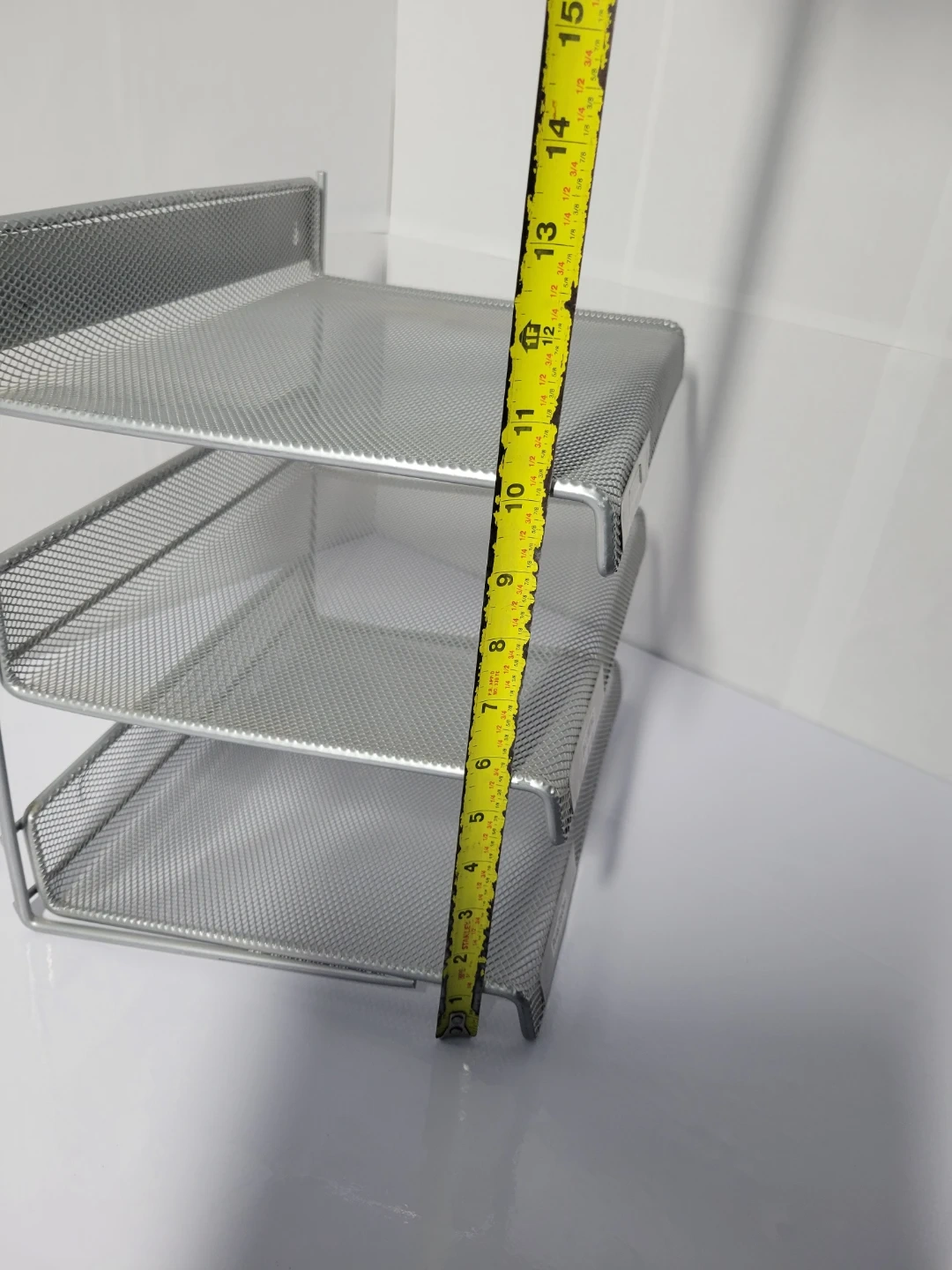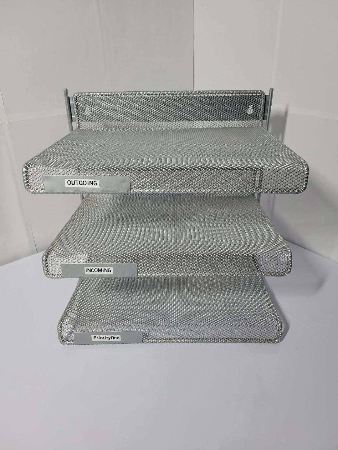 Here's a handy silver metal mesh desk organizer with three tiers! It's perfect for keeping your documents and papers sorted.
