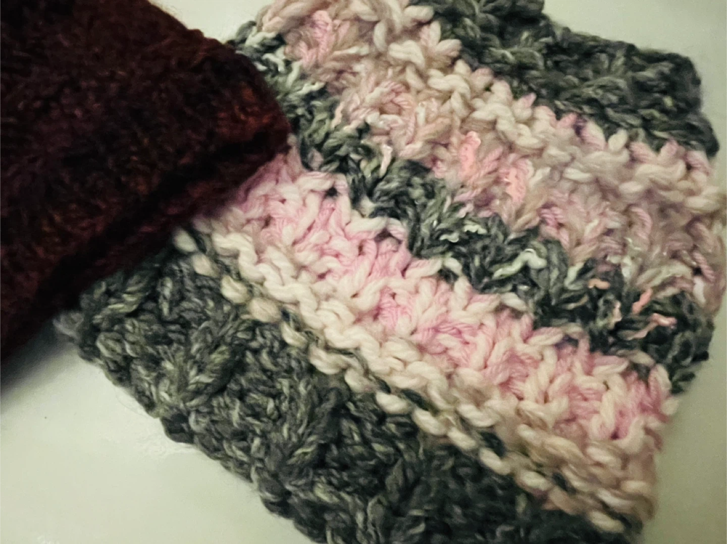 Selling a set of two hand-knitted messy bun hats. One is a mix of brown and orange tones, and the other is a blend of grey, pink, and white. They're perfect for keeping warm during the colder months!