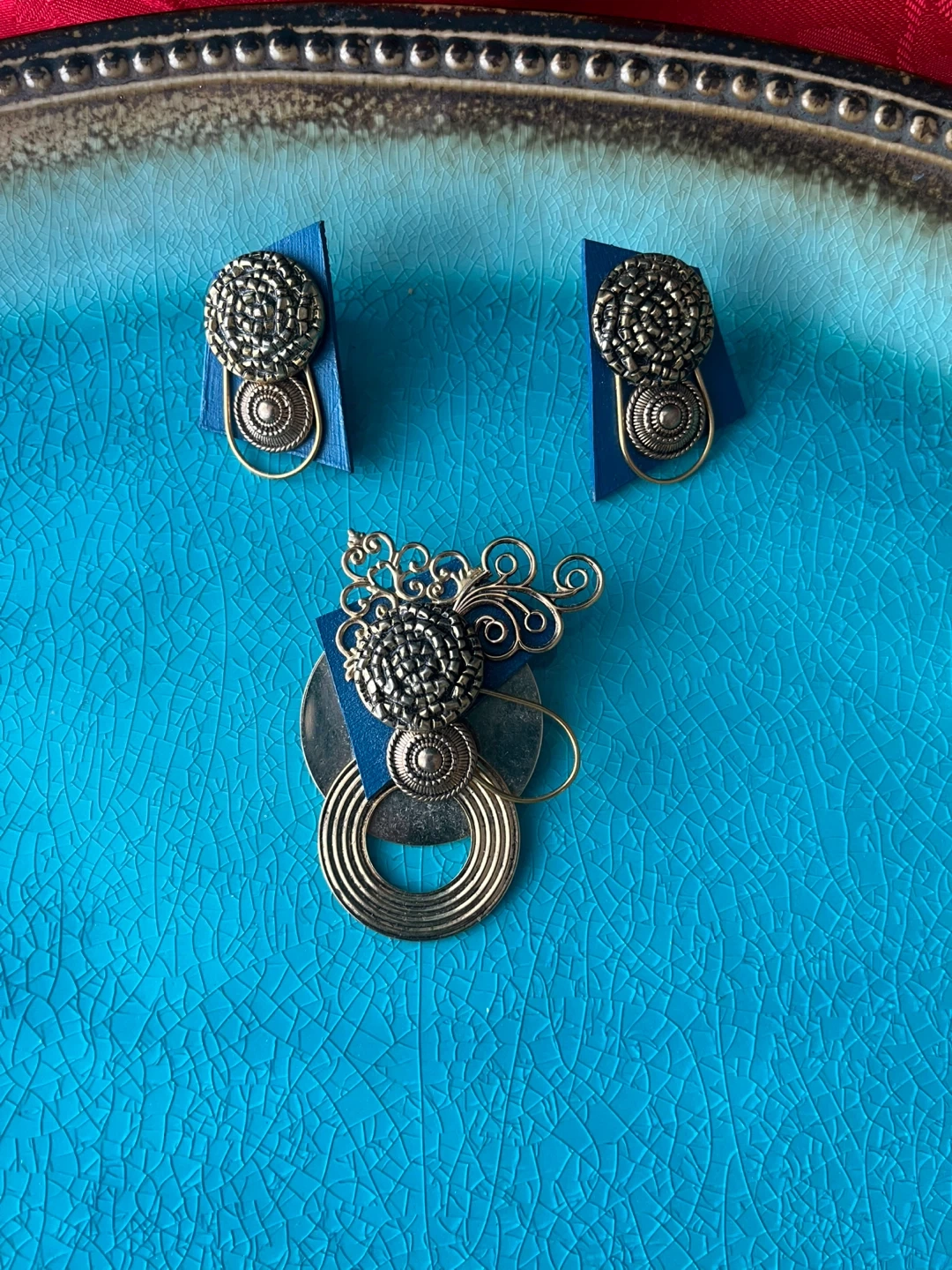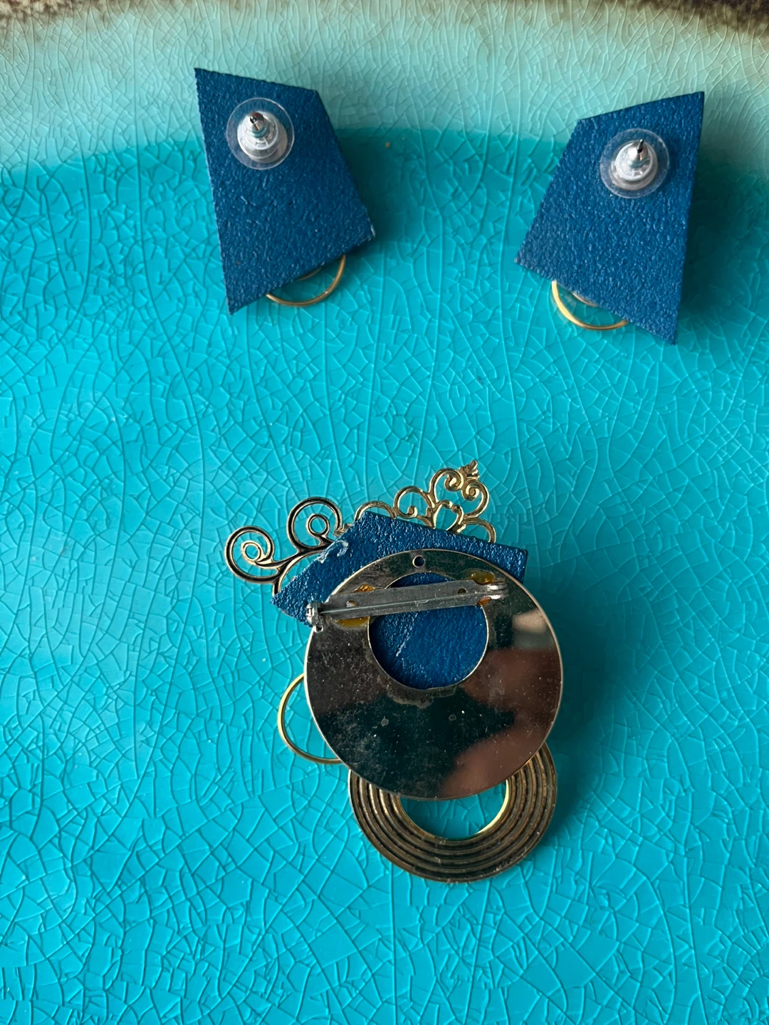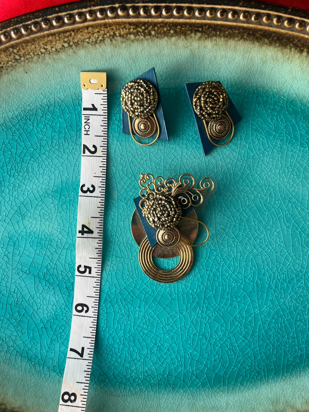 This is a lovely set of hand made vintage-style earrings and a brooch. The pieces feature intricate designs with a mix of gold and blue accents.