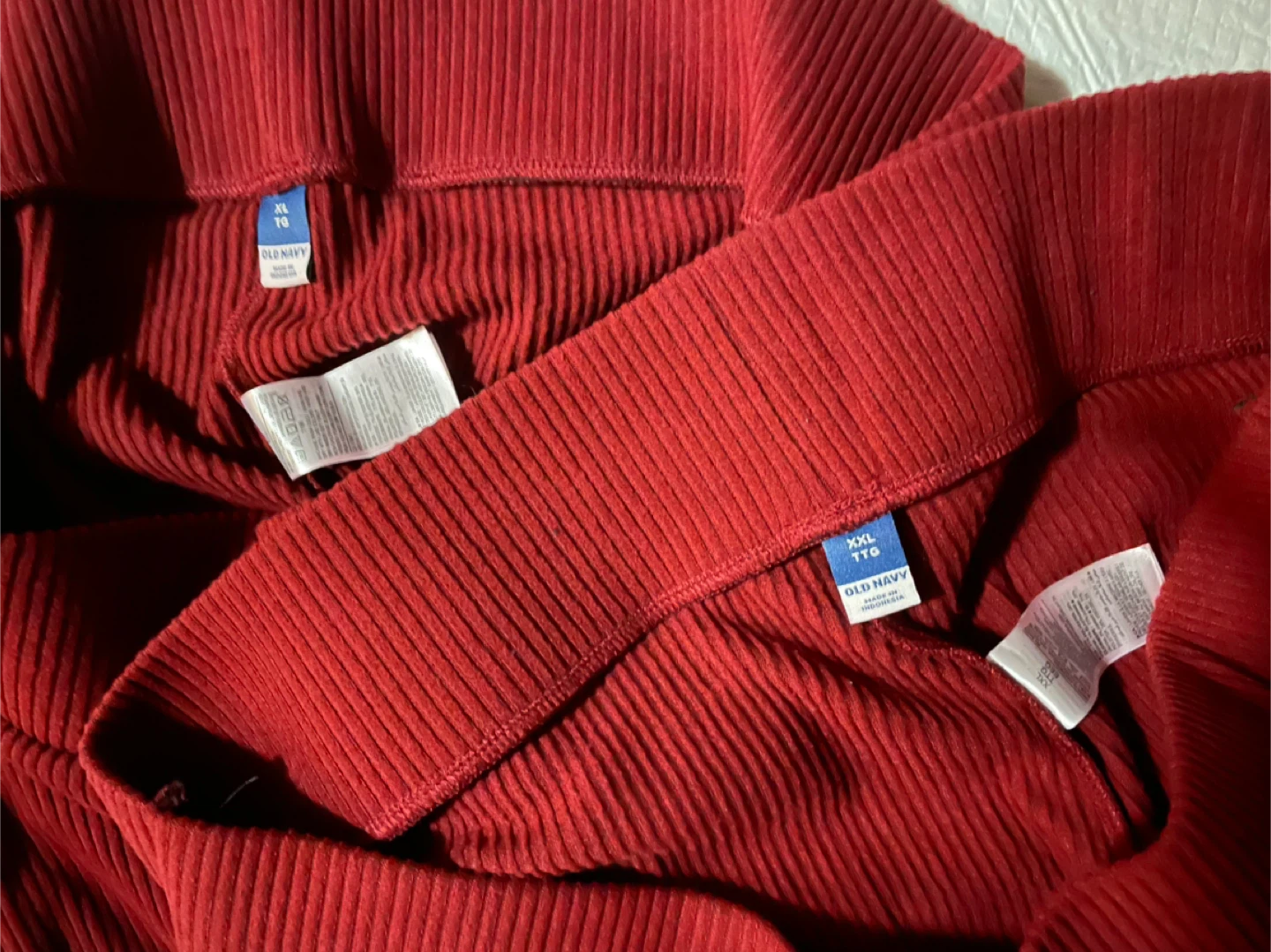 Two pairs of Old Navy ribbed leggings available! One is size XL and the other is XXL. Both are in a lovely burgundy colour and made of a soft, ribbed material. Perfect for lounging or casual wear