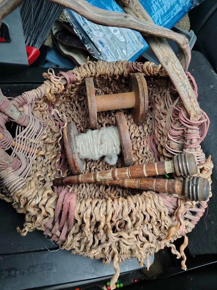 I don't know the specific names of the items but it's an old basket that has some items from an old sheep farm. Two spools. $50 obo