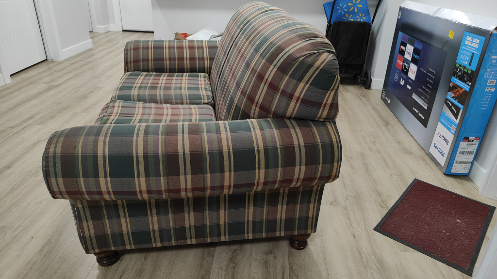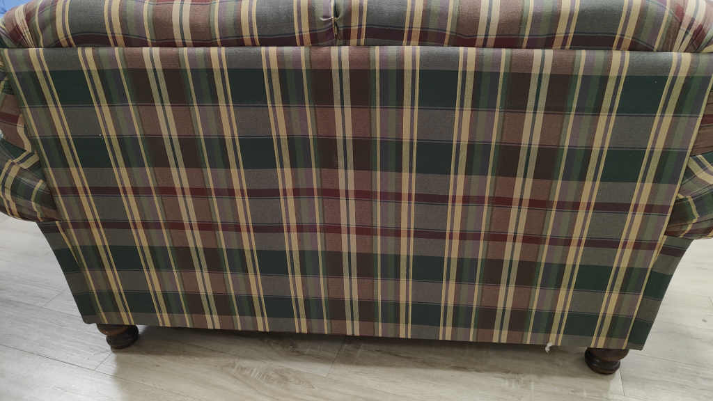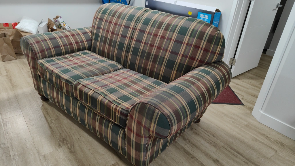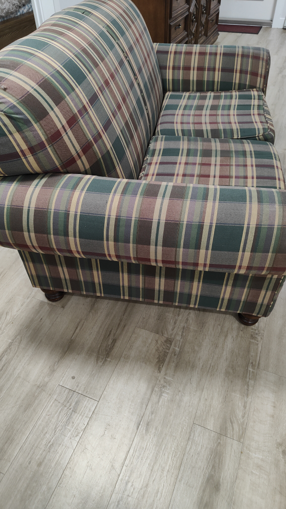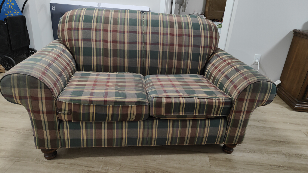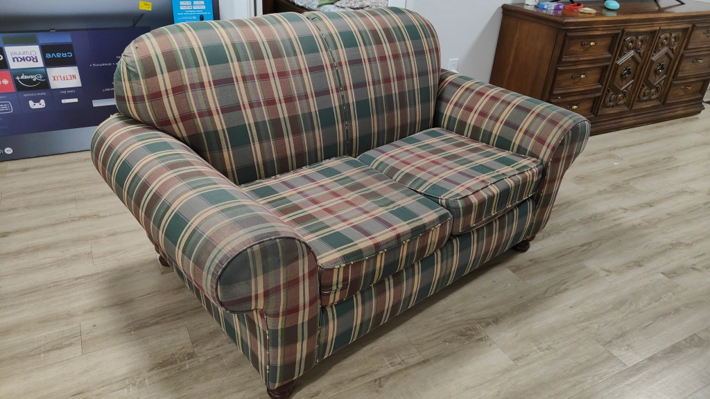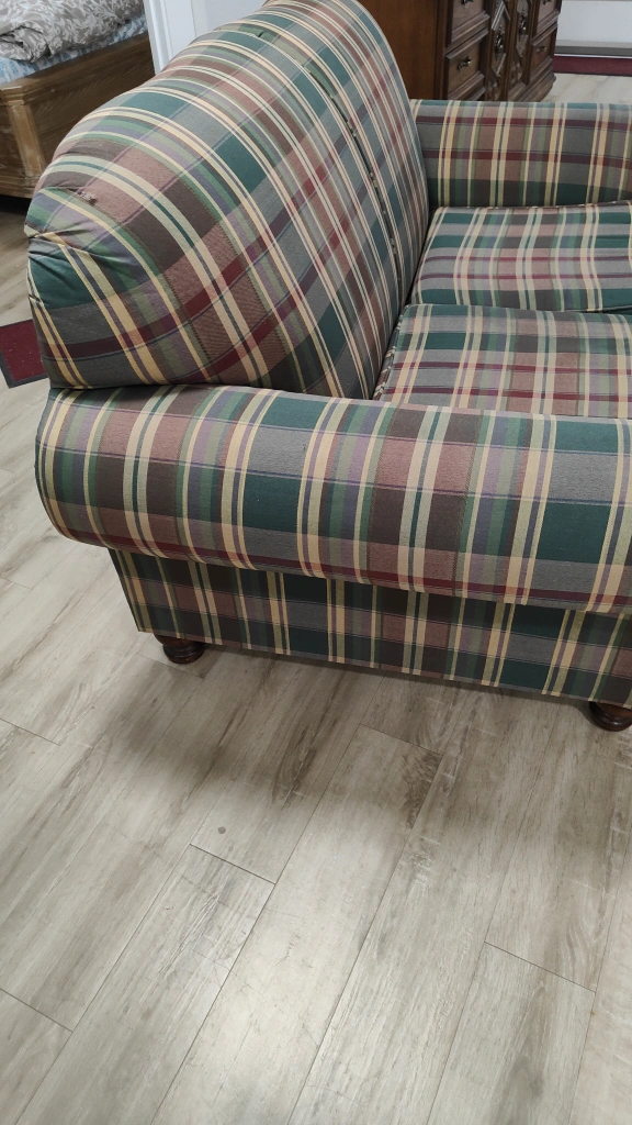 Selling a cozy loveseat sofa with a classic plaid pattern. It's perfect for a smaller space or as an addition to your living room. There is a small tear on one of the arms, as shown in the pictures. This sofa is suitable for 2 person.