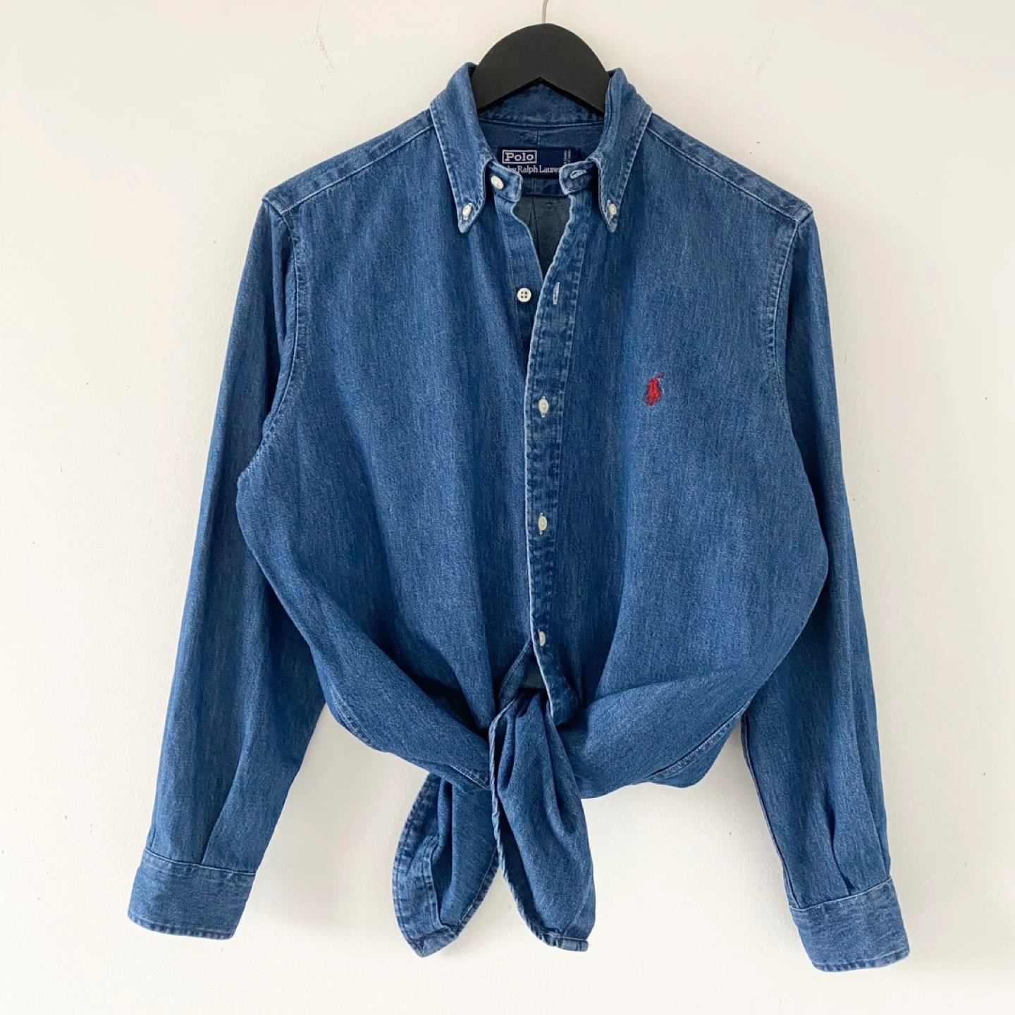 90's Polo by Ralph Lauren button-down shirt. Size Men's S. Made of light to medium weight 100% cotton in blue denim with a red embroidered logo. Well made - inside seams are finished with french seams. There’s no staining or damage. It's clean and in excellent condition.