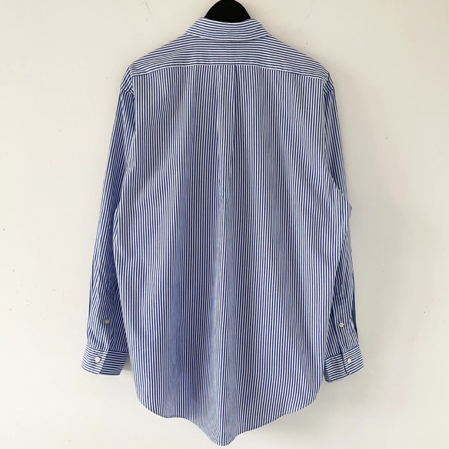 Ralph Lauren button-down shirt. Size Men's 16. Made of lightweight 100% cotton in blue and white stripes with an embroidered logo. Well made - inside seams are finished with french seams. There’s no staining or damage. It is clean and in excellent condition.