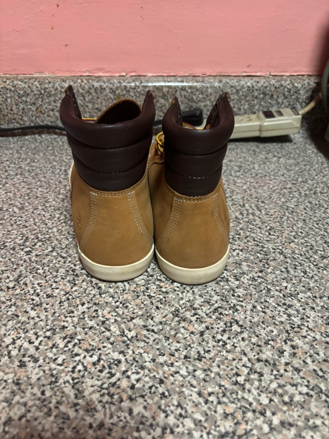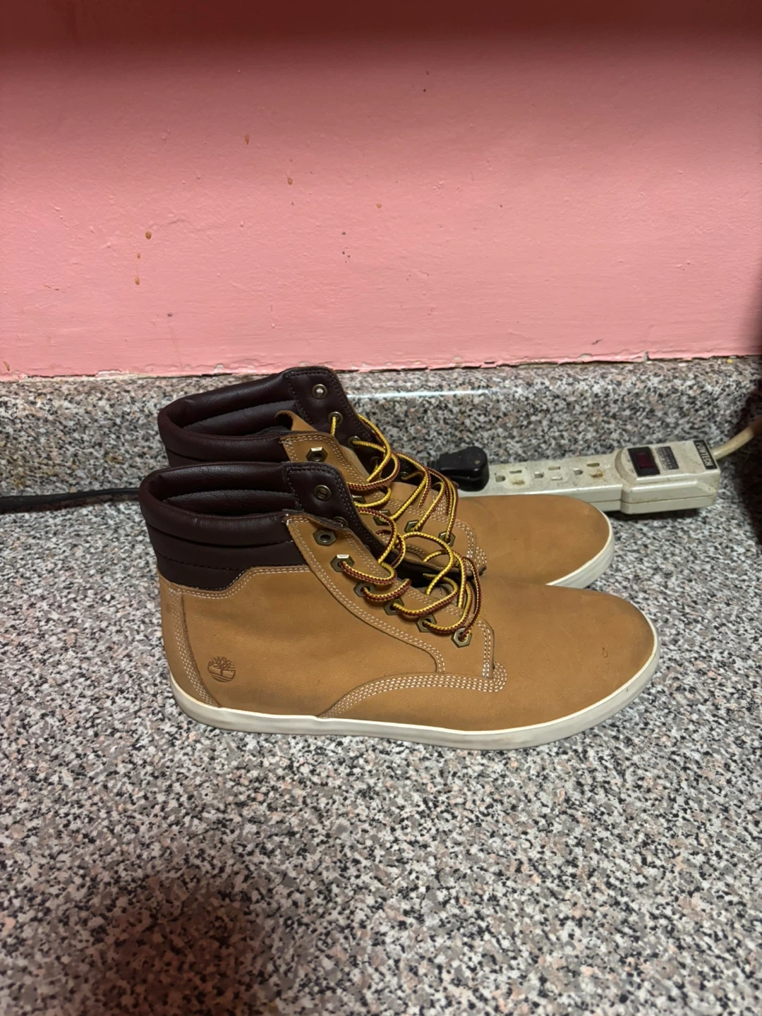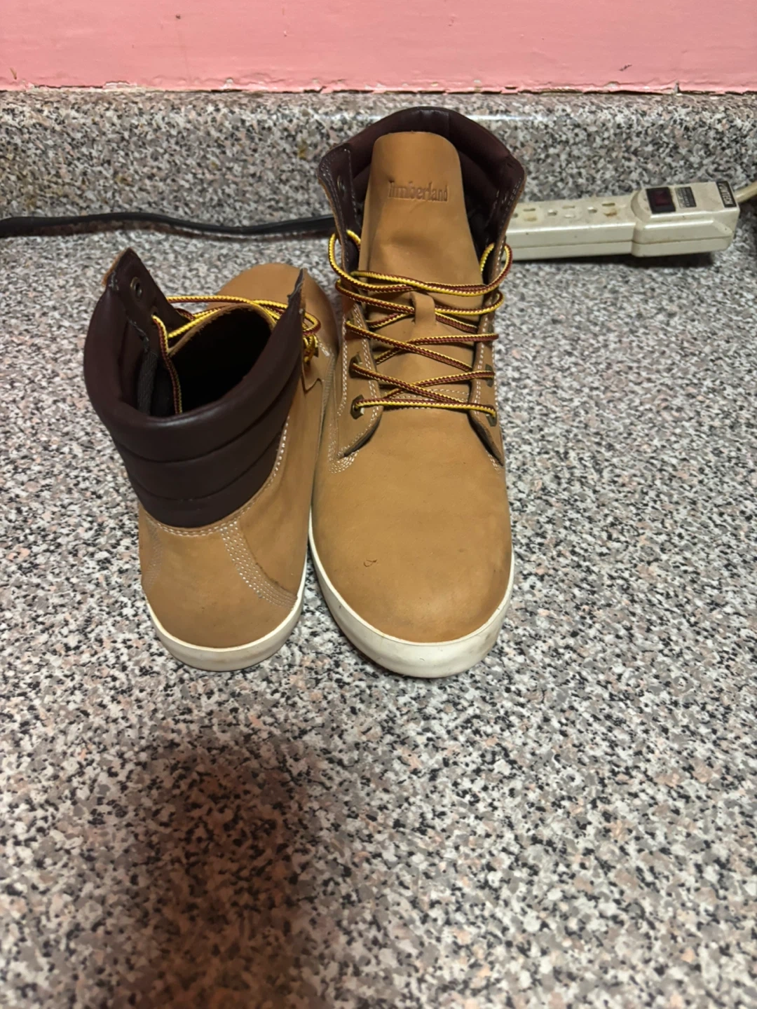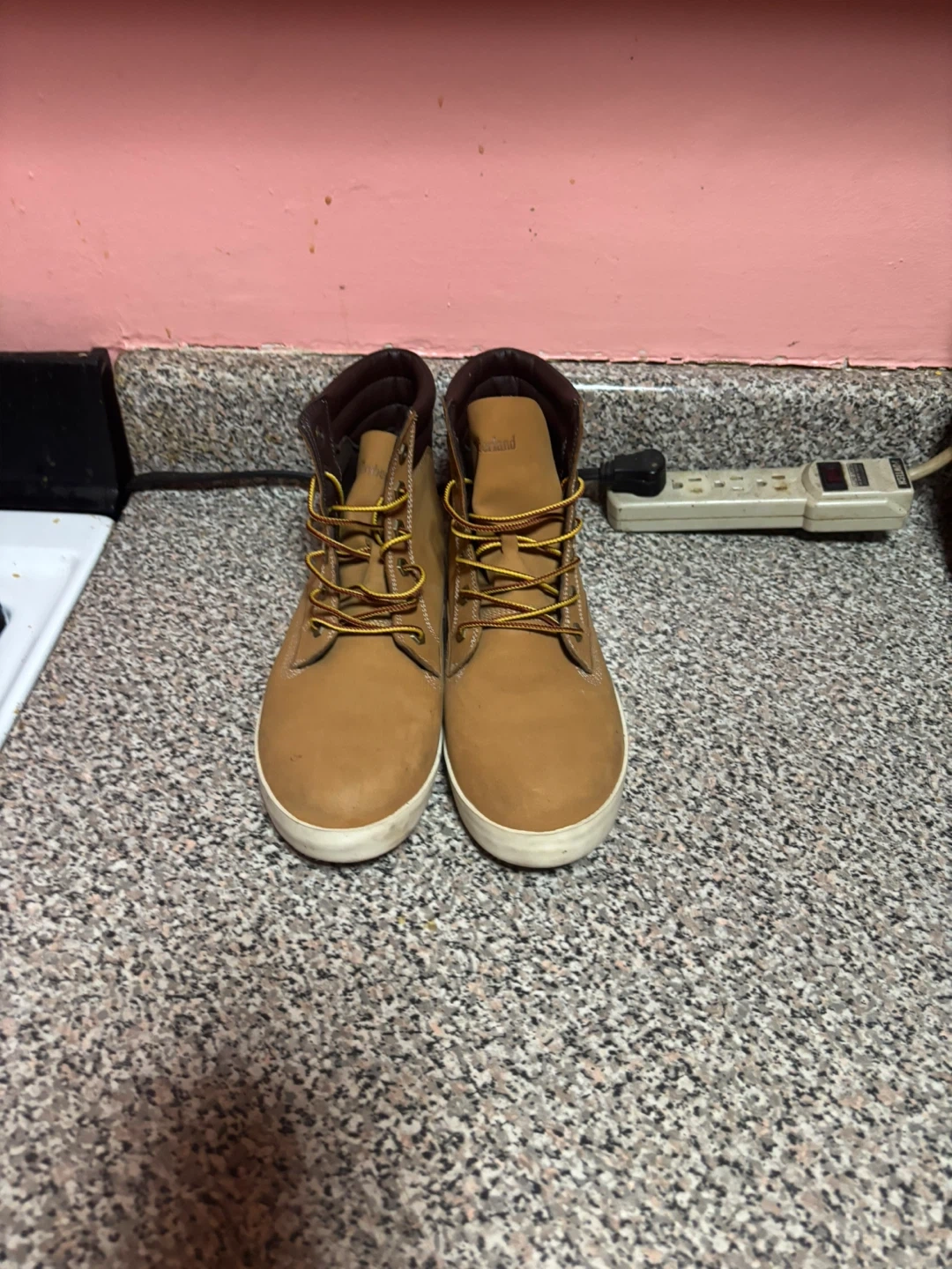 Selling a pair of Timberland high-top sneakers in tan leather. They're in good condition and ready for a new owner! Perfect for everyday wear.