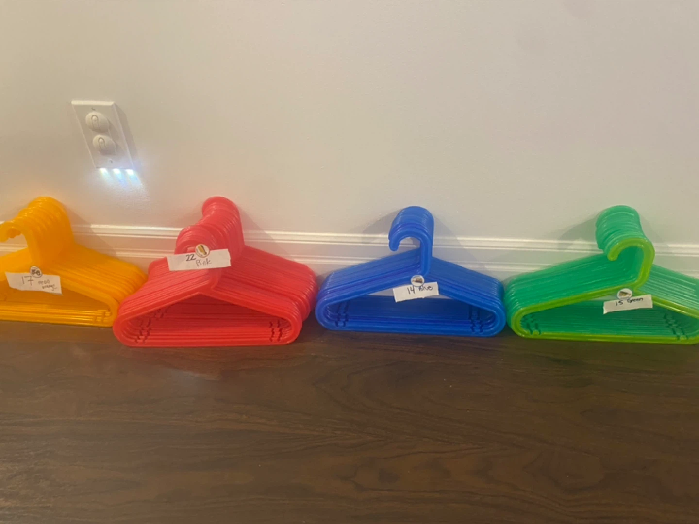 I have a bunch of colourful plastic clothes hangers for sale! There are yellow, red, blue and green hangers. They're perfect for organizing your closet and adding a pop of colour