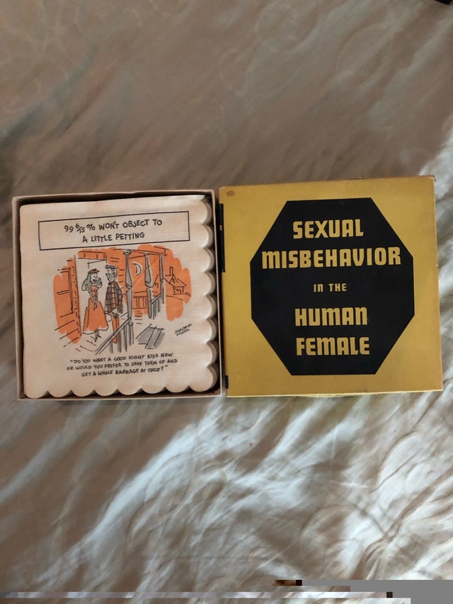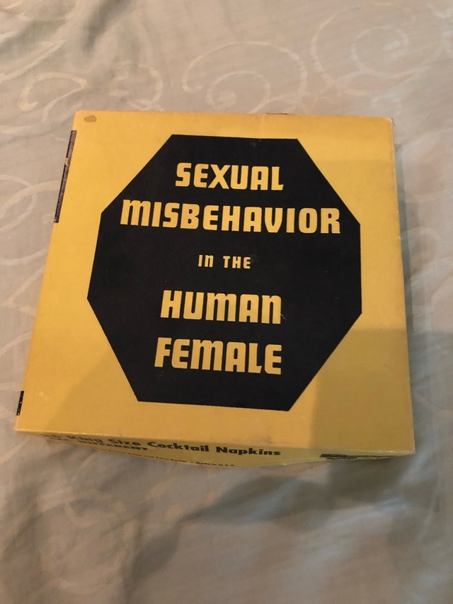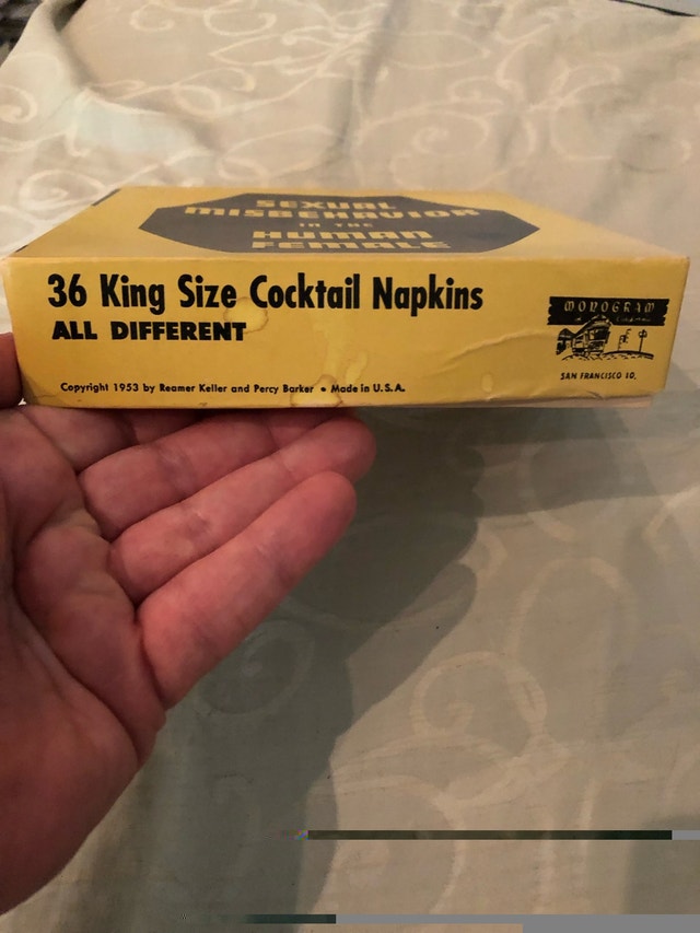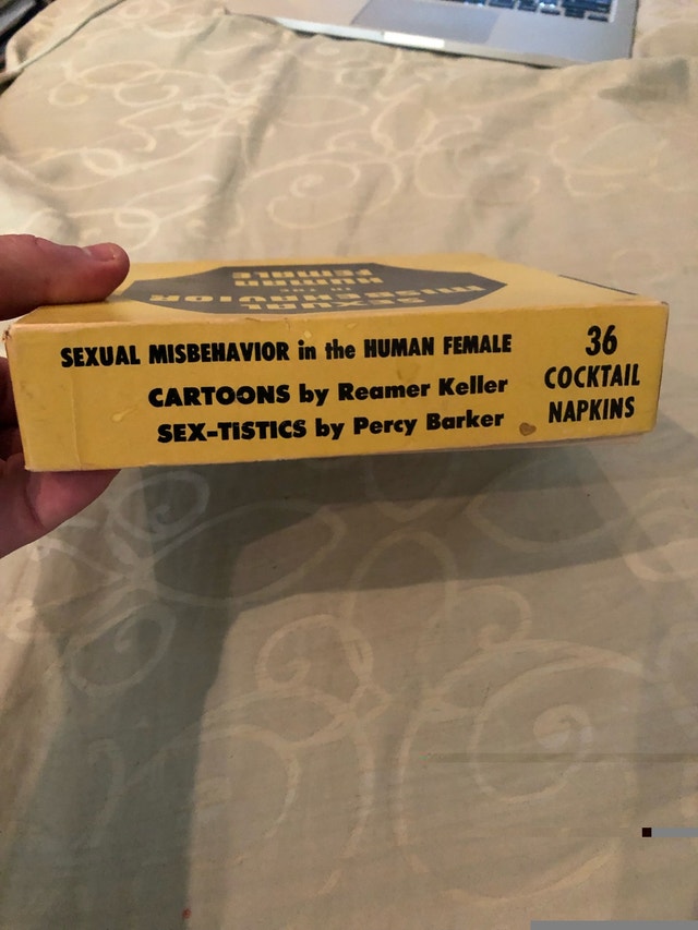 Spice up any cocktail hour with these risqué vintage cocktail napkins! Excellent condition: Vintage Box of "Sexual Misbehavior In the Human Female" King Size Cocktail Napkins. Like brand new condition. Never used. 1953 Paper Cocktail Napkins Sexual Misbehavior Jokes Cartoons Keller Barker. Made by Monogram of California, San Francisco. Measure approx 5.75" square, without the scallop. Dated 1953 on the side of the box. 36 Napkins with 36 different cartoons by Reamer Keller and 36 different Sex-Tistics by Percy Barker. It would make a fantastic novelty gift or conversation piece!