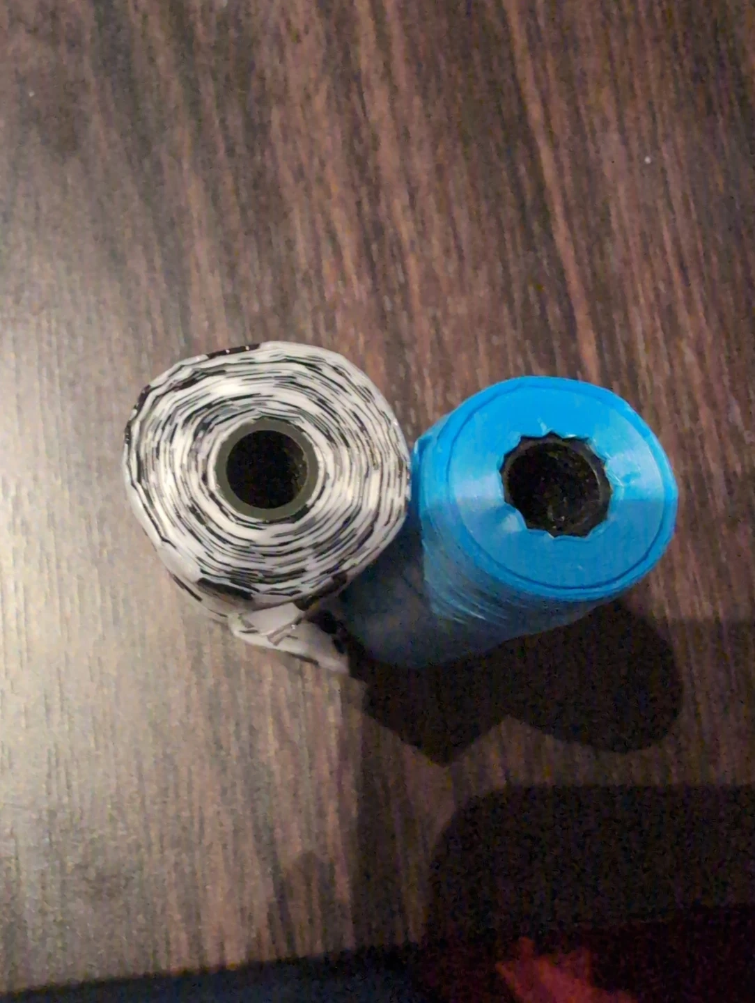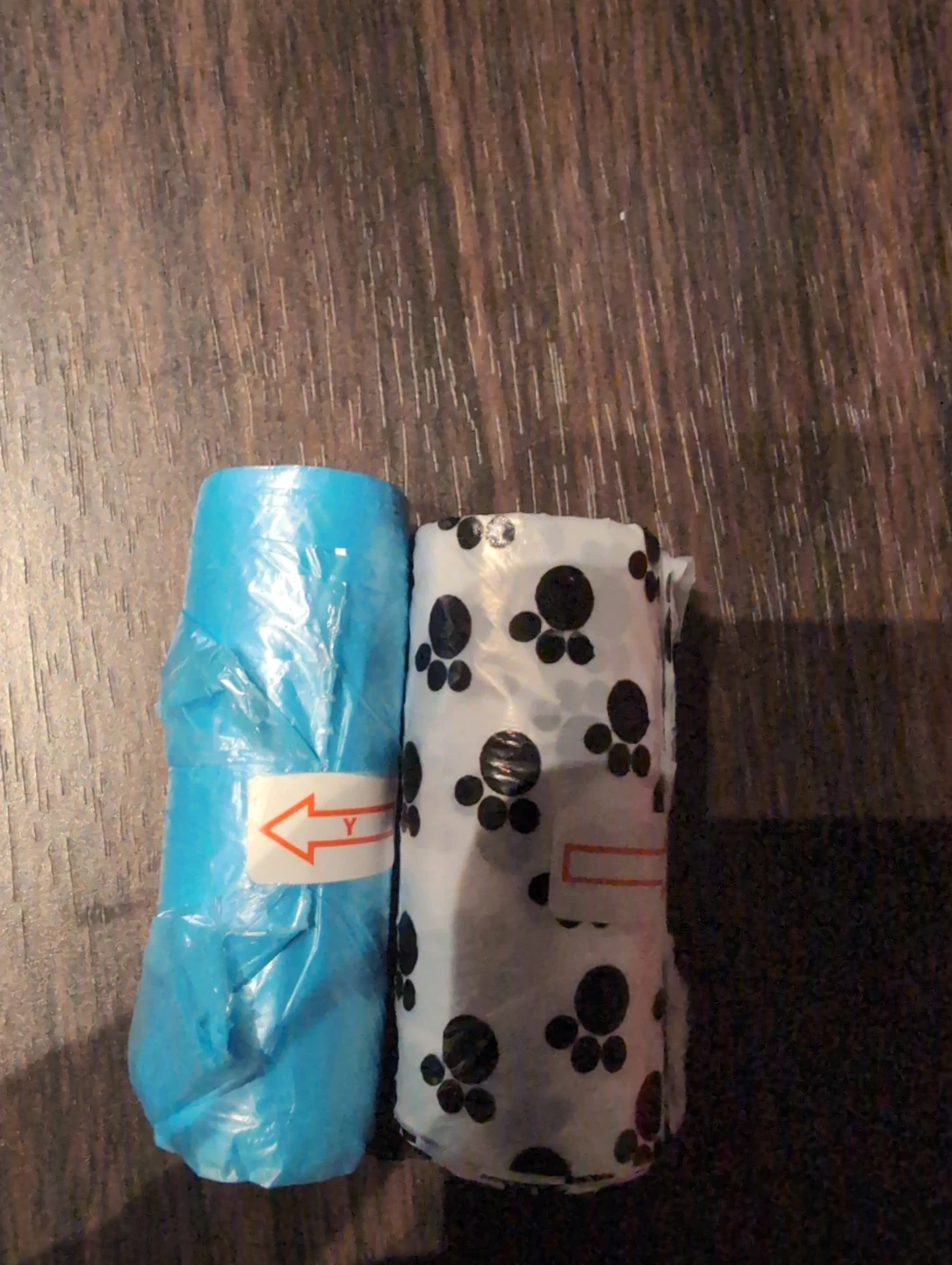 Selling two rolls of dog poop bags! One is a solid blue colour and the other has a cute paw print design. Perfect for keeping things tidy during walks with your furry friend
