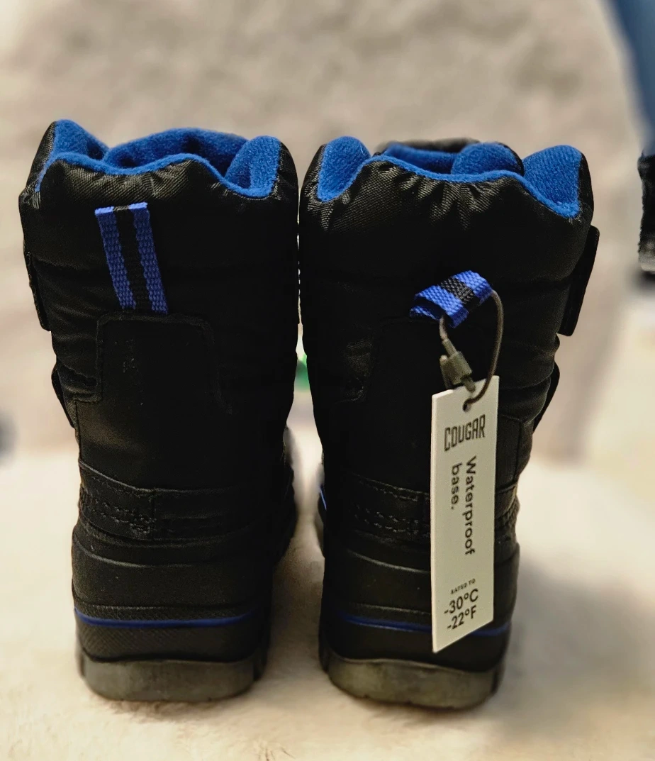 Keep your little one's feet warm with these adorable Cougar black and blue winter snow boots! They look to be in great condition and ready for some winter fun, waterproof base Rated to -30 Degrees Celsius or -22 Degrees Fahrenheit