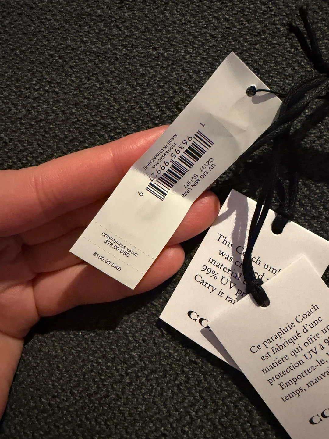 This Coach umbrella is brand new with tags! It's a mini umbrella with a material that provides 99% UV protection. It originally retailed for $72 USD or $100 CAD.