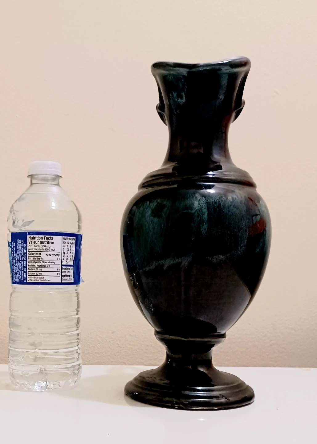Vtg. BMP striking art pottery pitcher features a beautiful green and black drip glaze, perfect for adding a touch of elegance to any room. As a used item, it carries a unique character and charm that only vintage pieces possess.