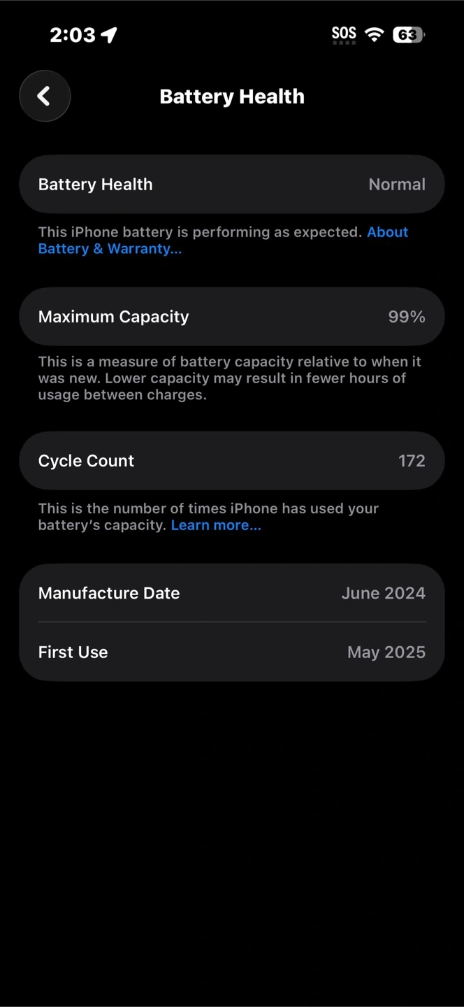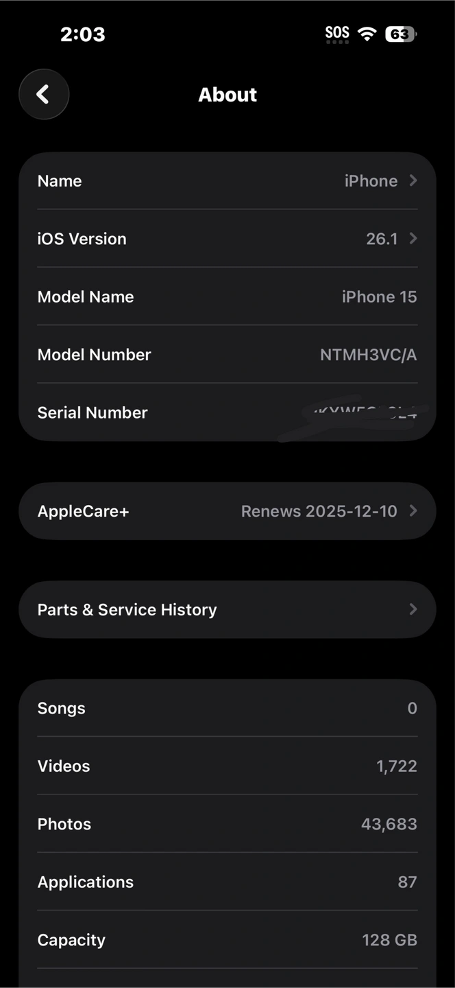 Selling an iPhone 15 with 128GB of storage! The battery health is at 99% and the manufacture date is June 2024. The AppleCare+ renews in 2025 December 10, and parts and service history is genuine.