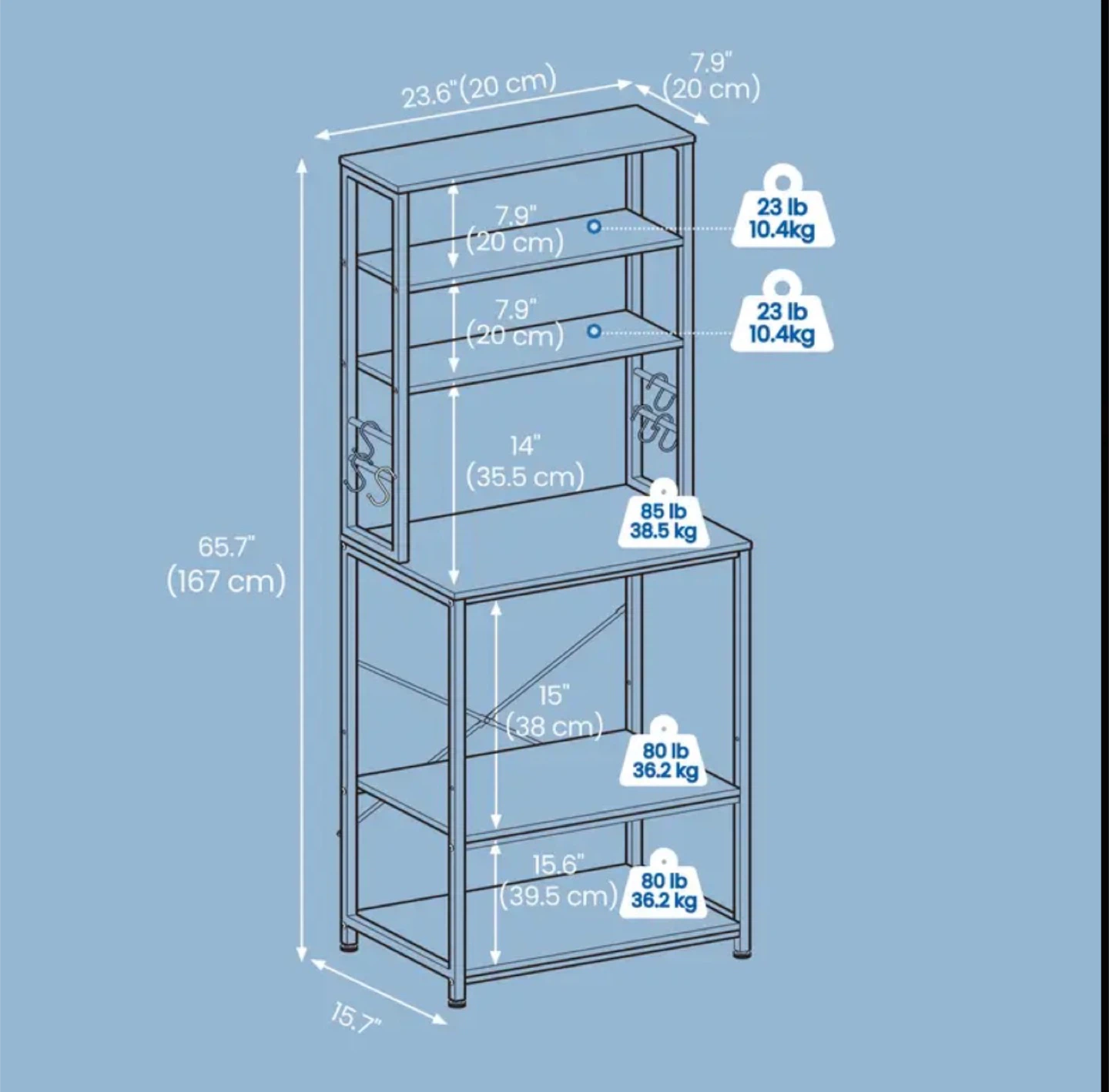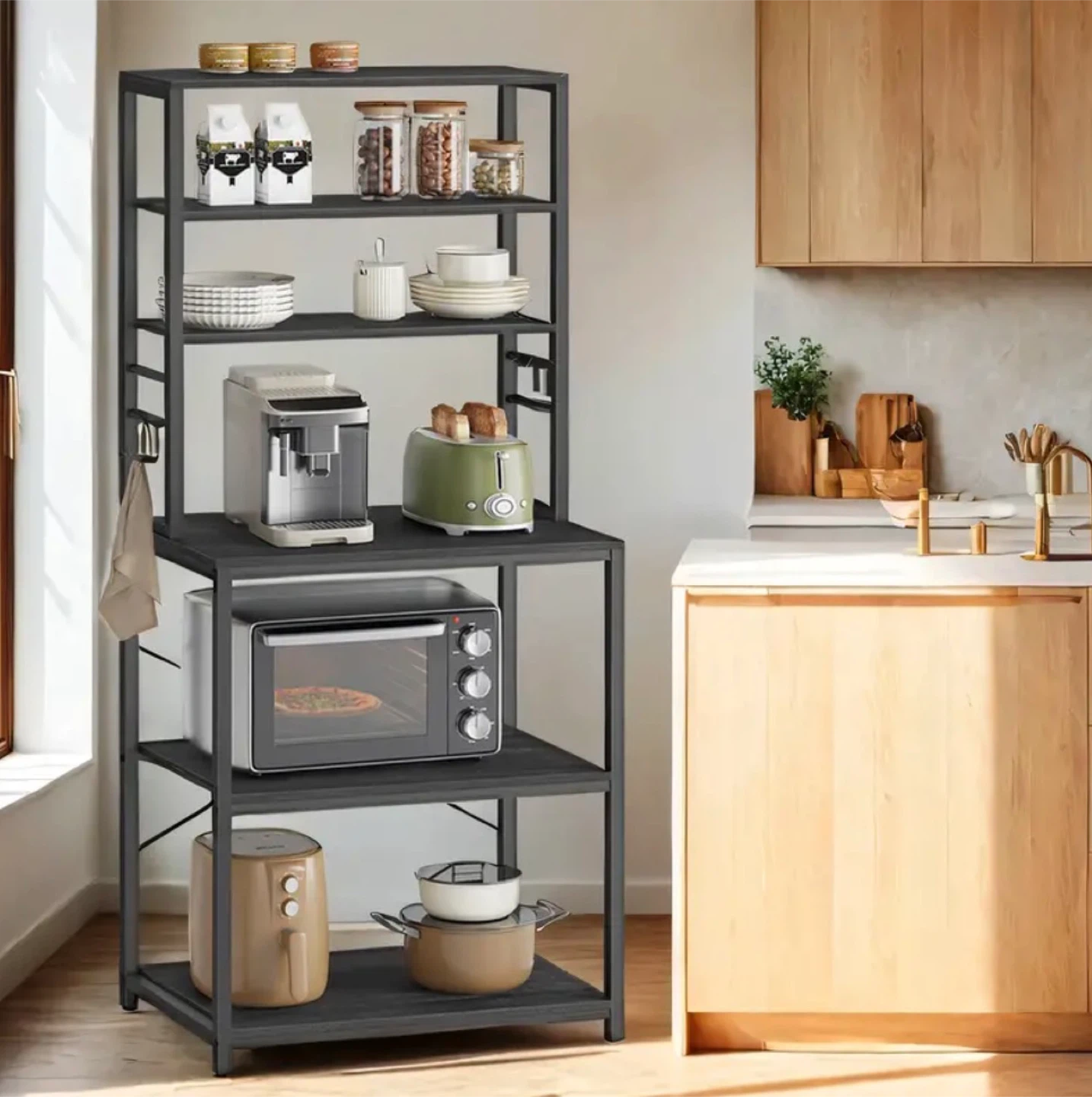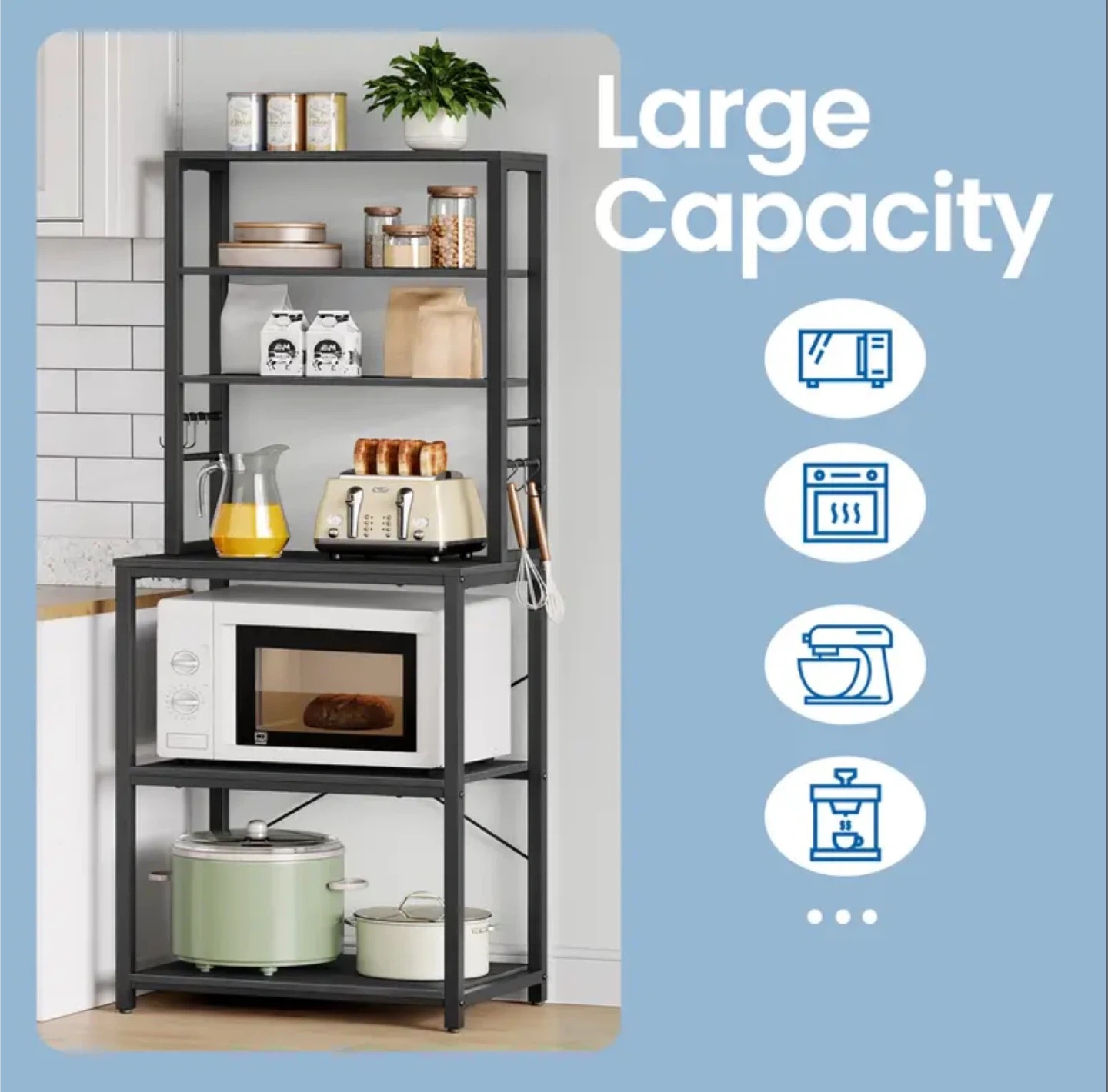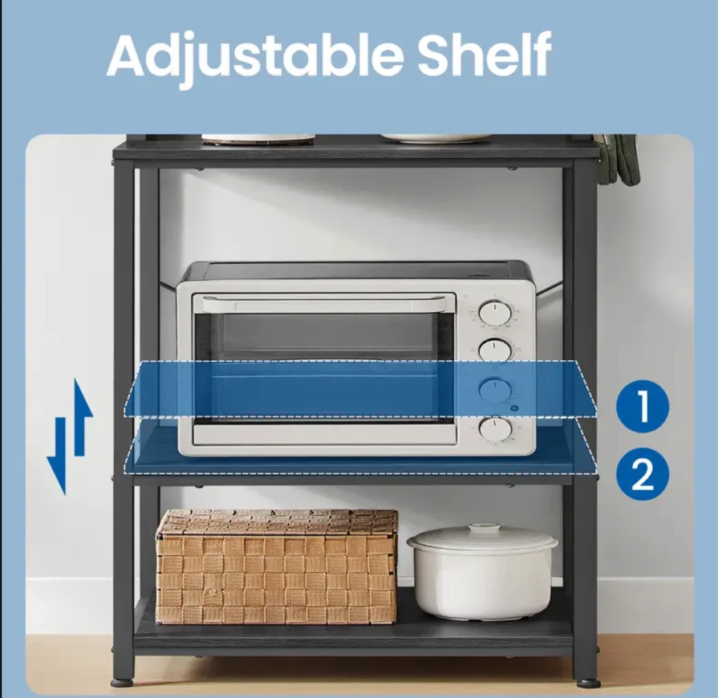 This large capacity kitchen baker's rack is perfect for organizing your kitchen appliances and cookware! It features adjustable shelves to accommodate different sized items. Sturdy product, made of stainless steel and wood.