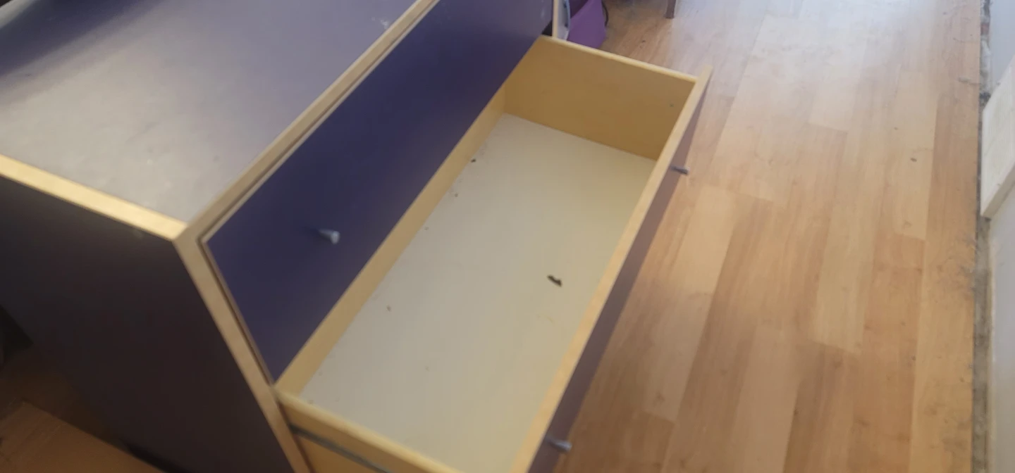 Selling a purple 3-drawer dresser! It's in good condition and ready for a new home. It's perfect for adding some colour to your bedroom or any other space where you need some extra storage
