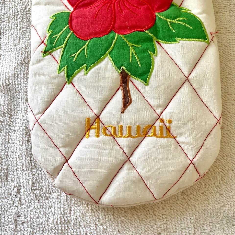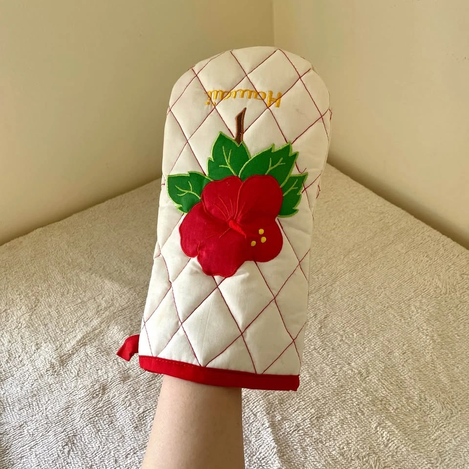 Quilted oven mitt with red hibiscus design. Features green leaves and 'Hawaii' embroidery.