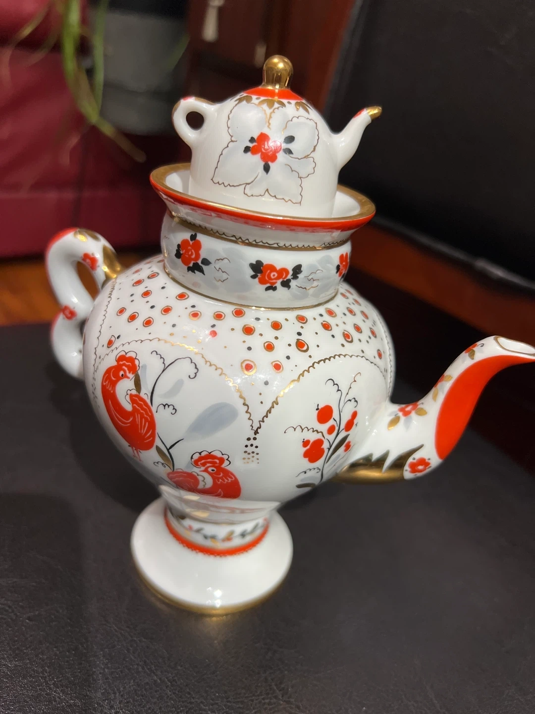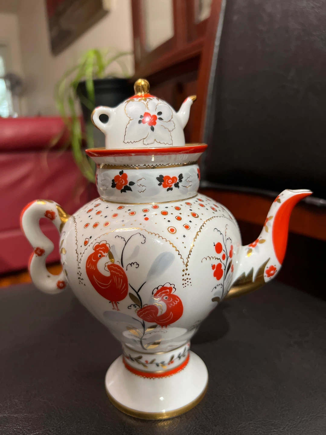 Here's a lovely Russian Imperial Porcelain St Petersburg tea pot samovar! It features a beautiful design with red and 22 carats gold accents. Perfect for adding a touch of elegance to your tea time