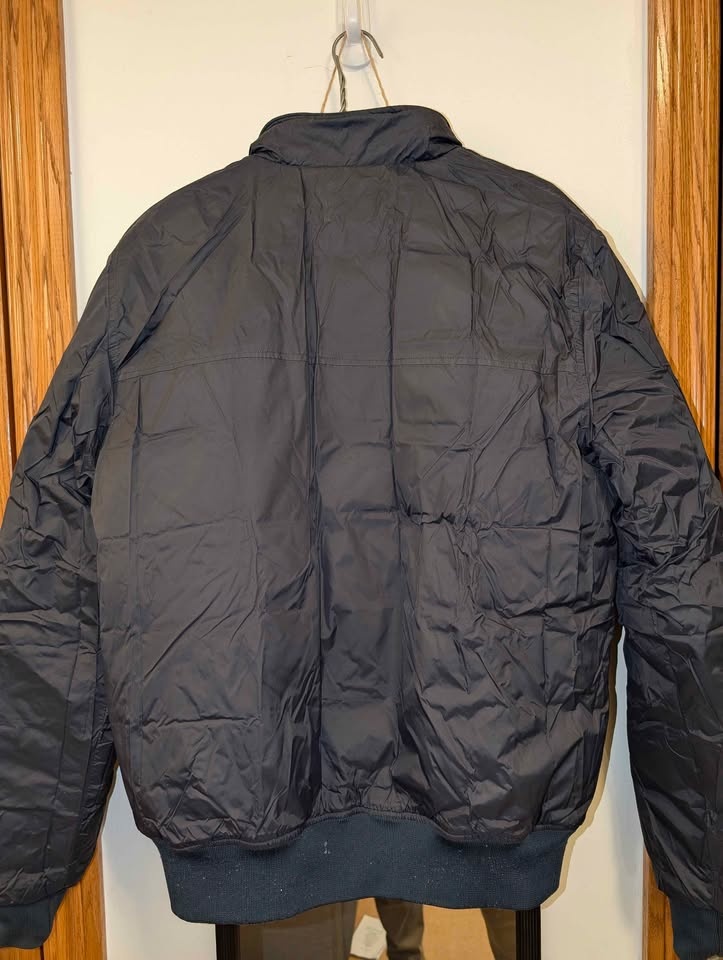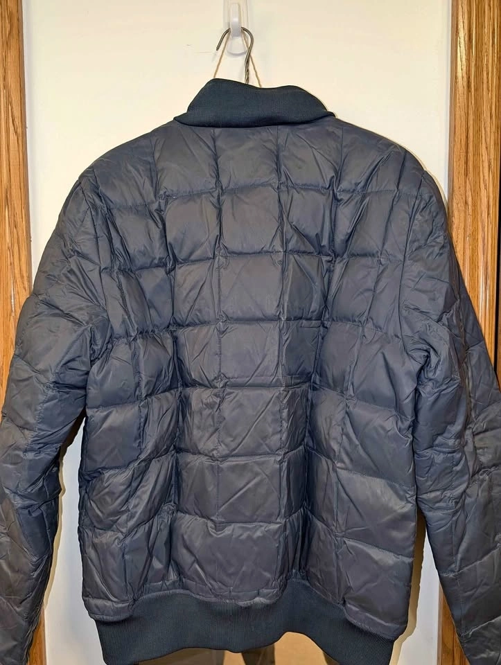 Very warm down jacket. The jacket is double faced with zippered pockets on the smooth side and buttoned pockets on the quilted side.