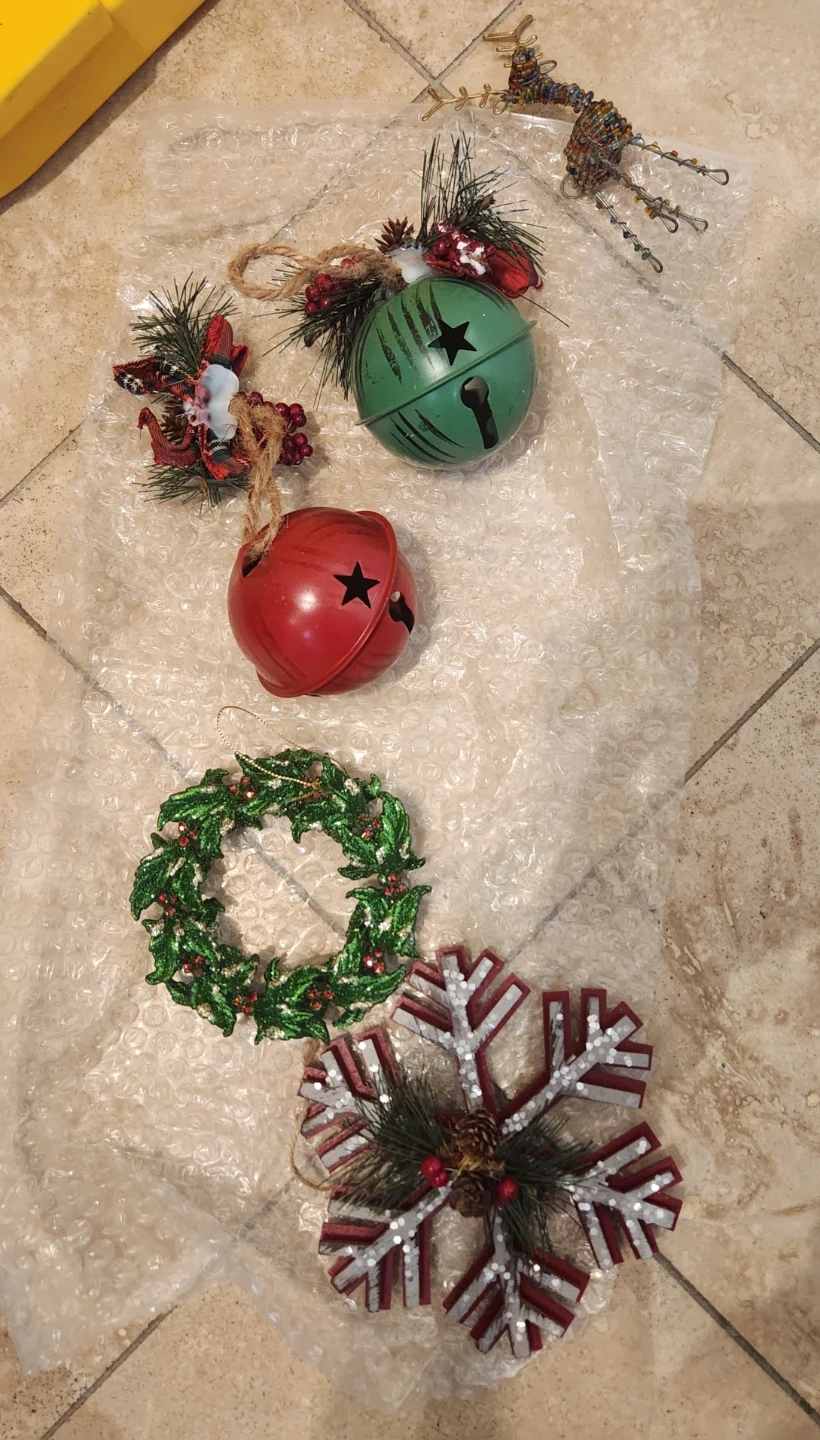 Gifting a set of Christmas ornaments! Includes a red bell, green bell, wreath, snowflake and reindeer ornament. Perfect for decorating your tree or home this holiday season.