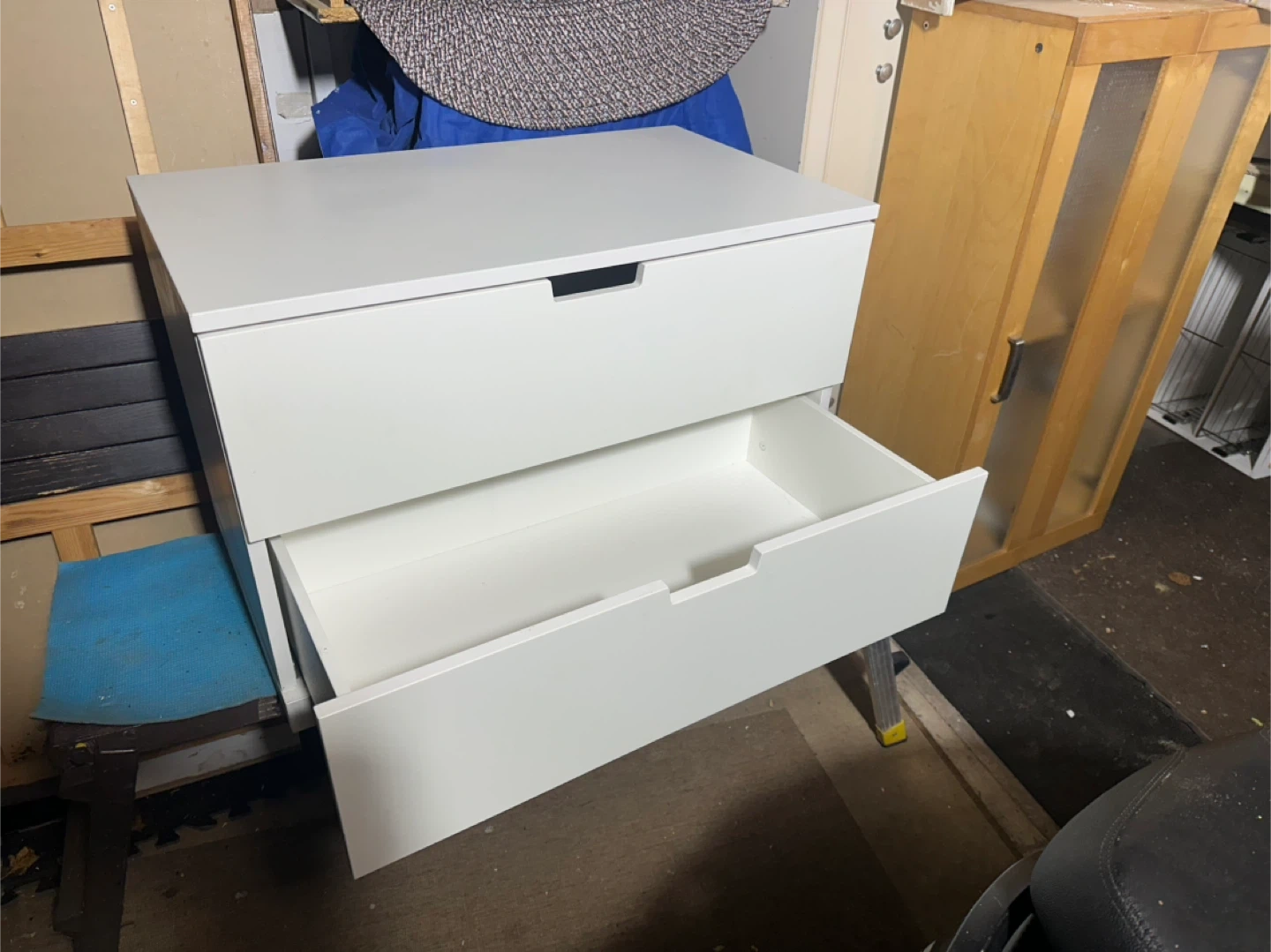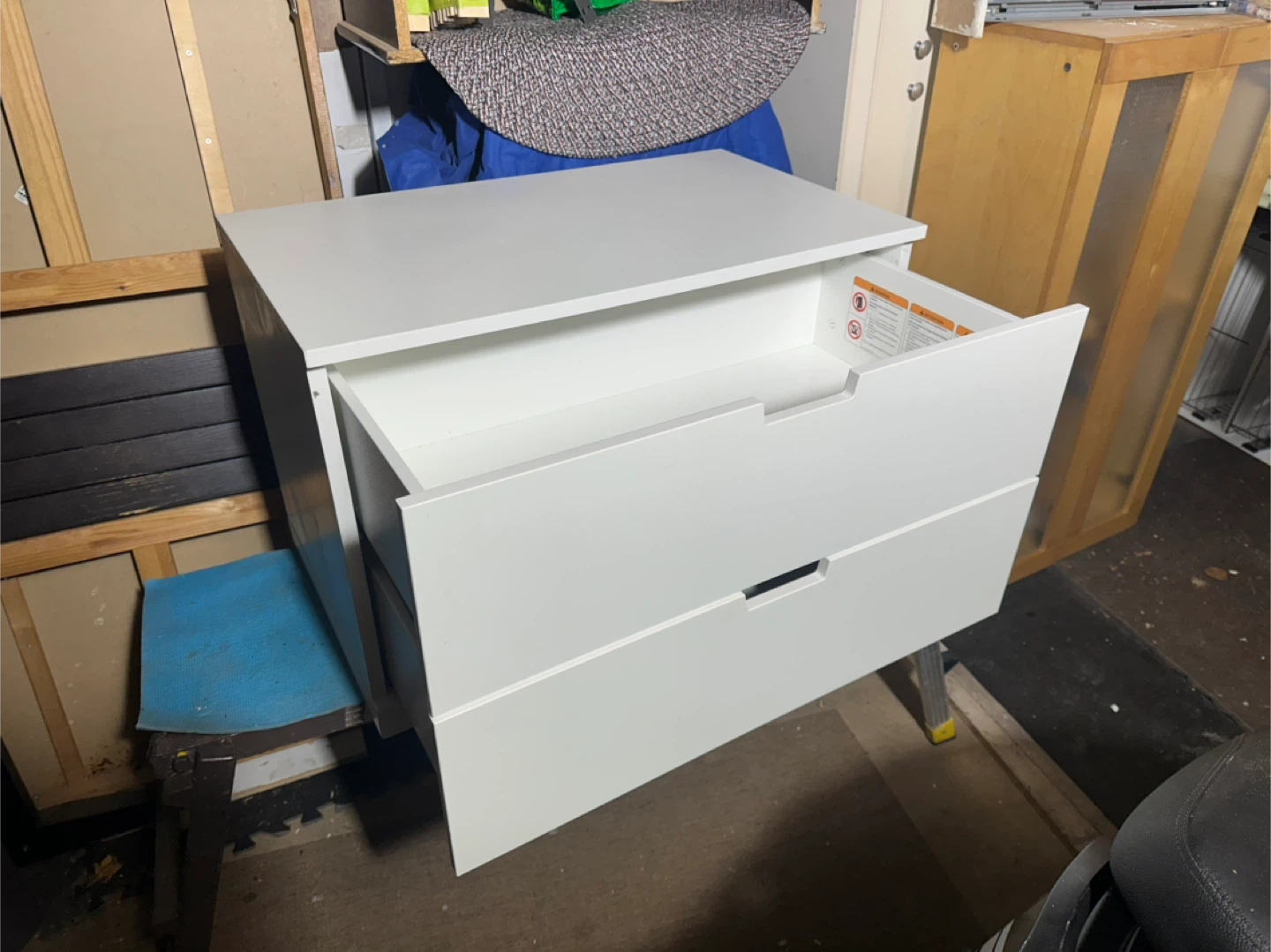 Selling a white two-drawer dresser! It's in great shape and ready for a new home. Perfect for adding some extra storage to your bedroom or any other room in your home.