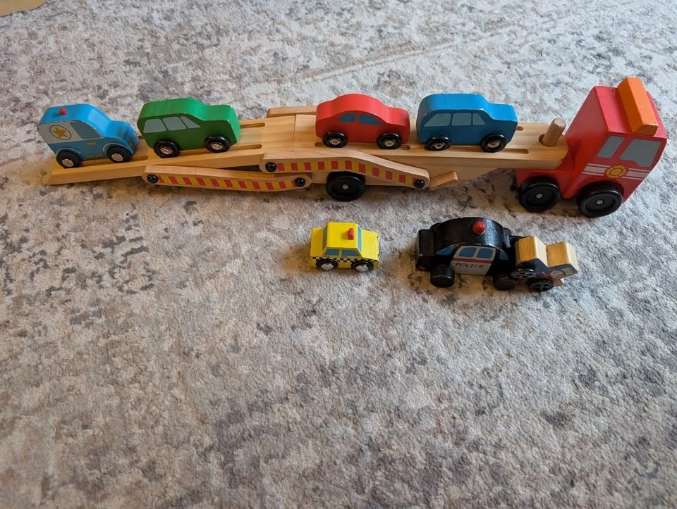 The three wooden cars on the carpet don't fit exactly on the transporter but you can have them if you like (taxi, police car, mini pick up truck).