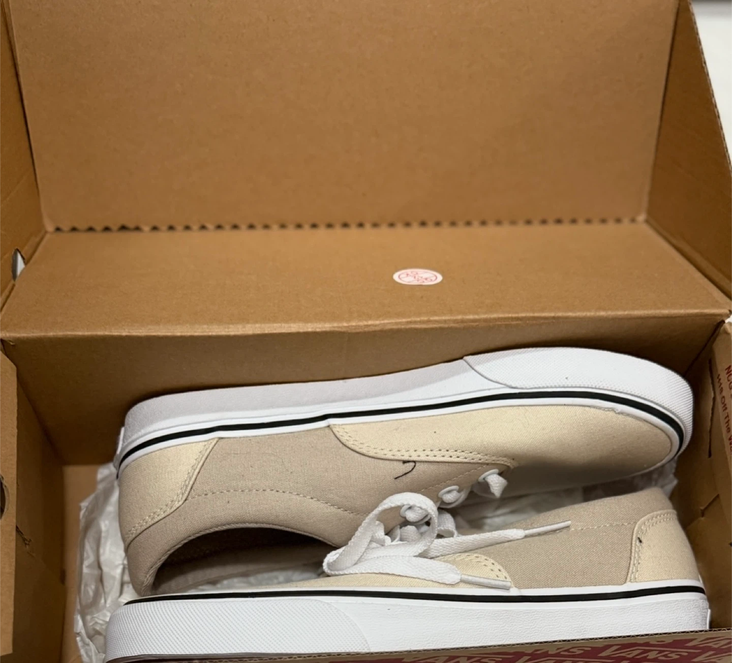 Selling a new pair of Vans Era sneakers in a lovely beige colour. They are in great shape and come with the original box! The size is 9 US. Perfect for everyday wear!