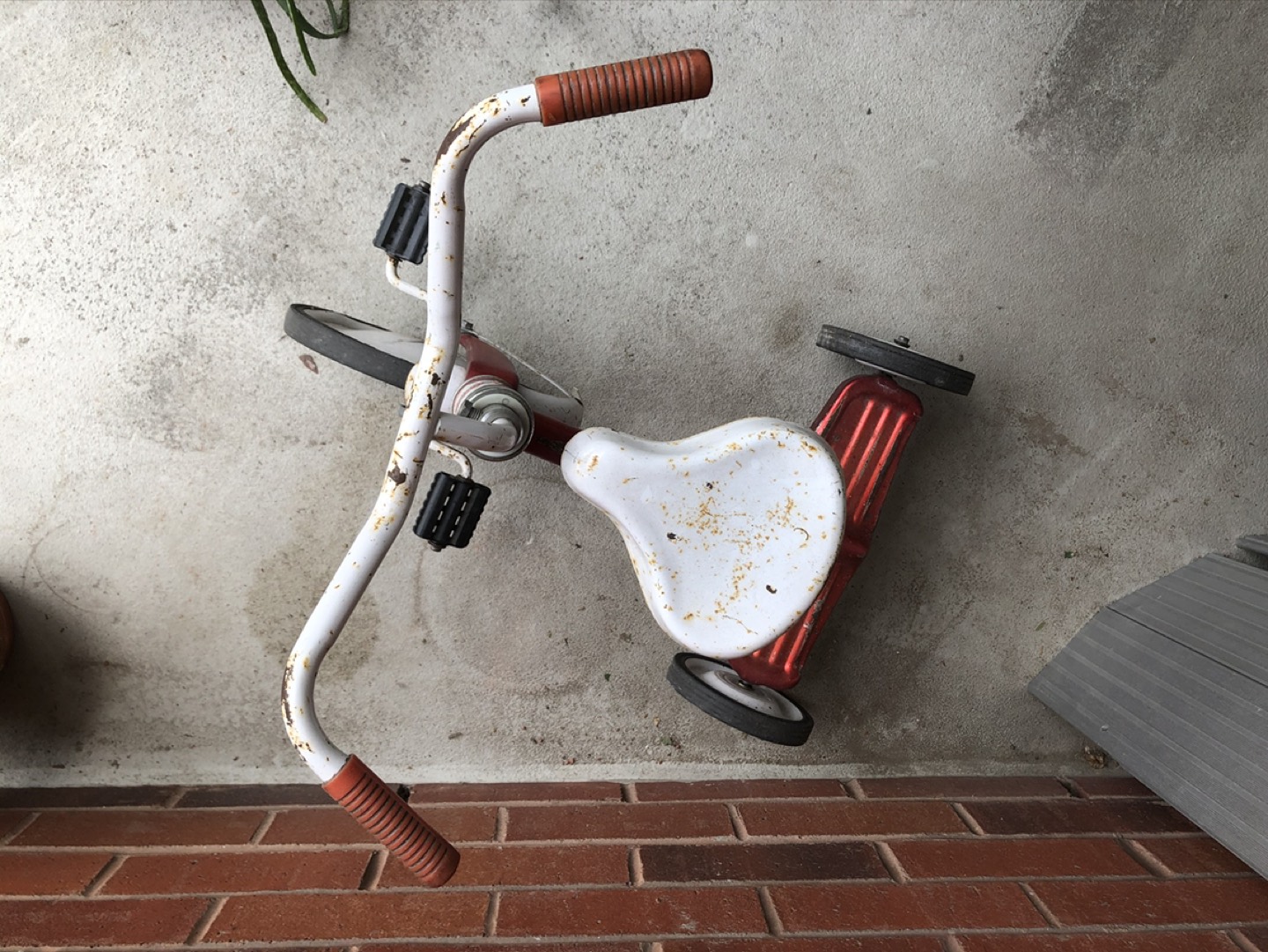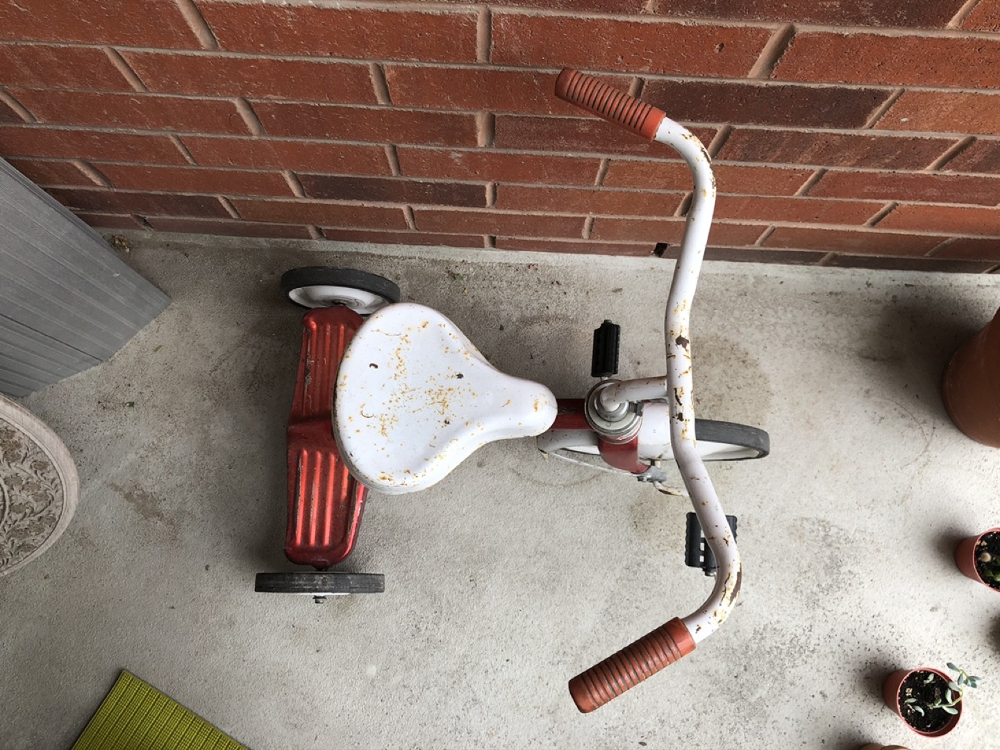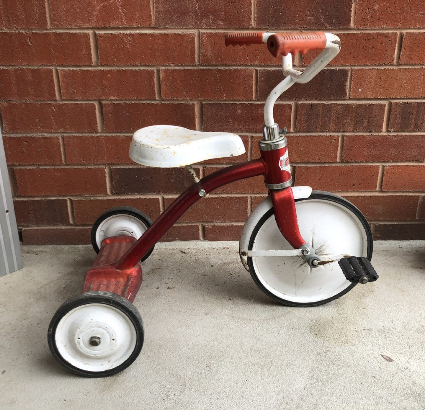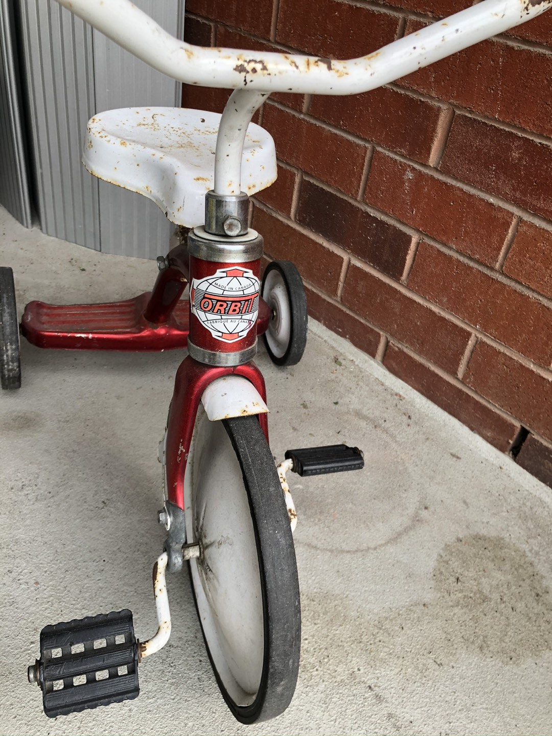 Vintage, metal Canadian made Orbit tricycle with white wall tires. Fully functional but well used. Could be restored into perfect condition if you’re into that.